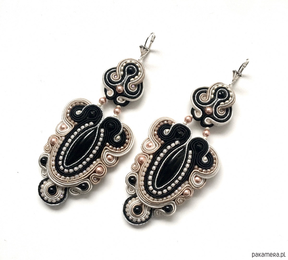 Eleganckie kolczyki z sutaszu z markizami onyks. Kolory: czarny, beżowy, ecru, srebrny. Długość 8 cm. Zawieszone na biglach ze stali chirurgicznej (możliwość zamiany na bigle). Tył wykończony ekologiczną skórą. Kolczyki wykonywane są na zamówienie.