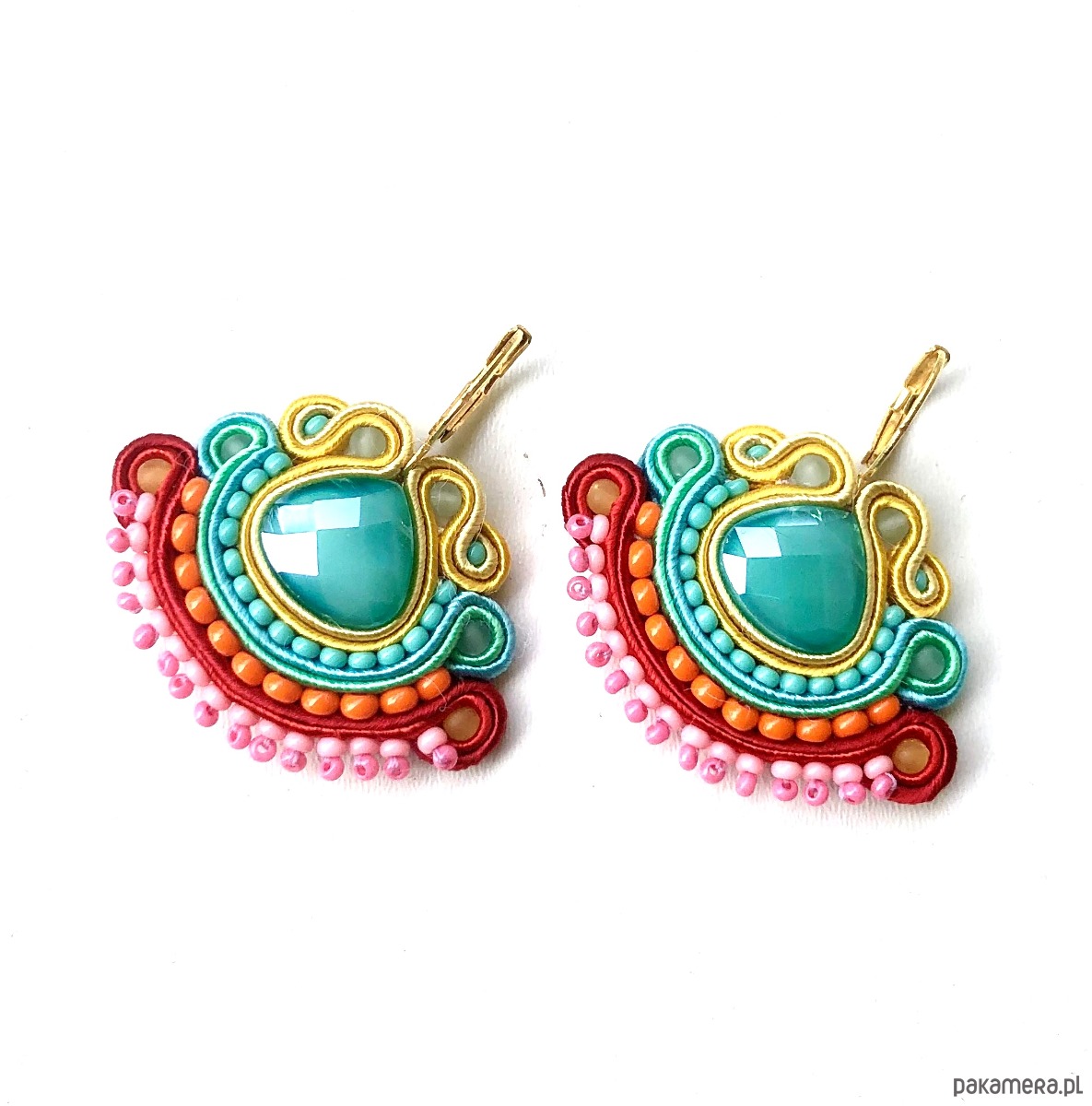 Kolczyki z sutaszu - w połączeniu jasnego różu, turkusu, żółtego i czerwieni. Długość ok. 3,5 cm. Zawieszone na antyalergicznych biglach, możliwość wymiany na klipsy lub sztyfty. Kolczyki wykonywane na indywidualne zamówienie.