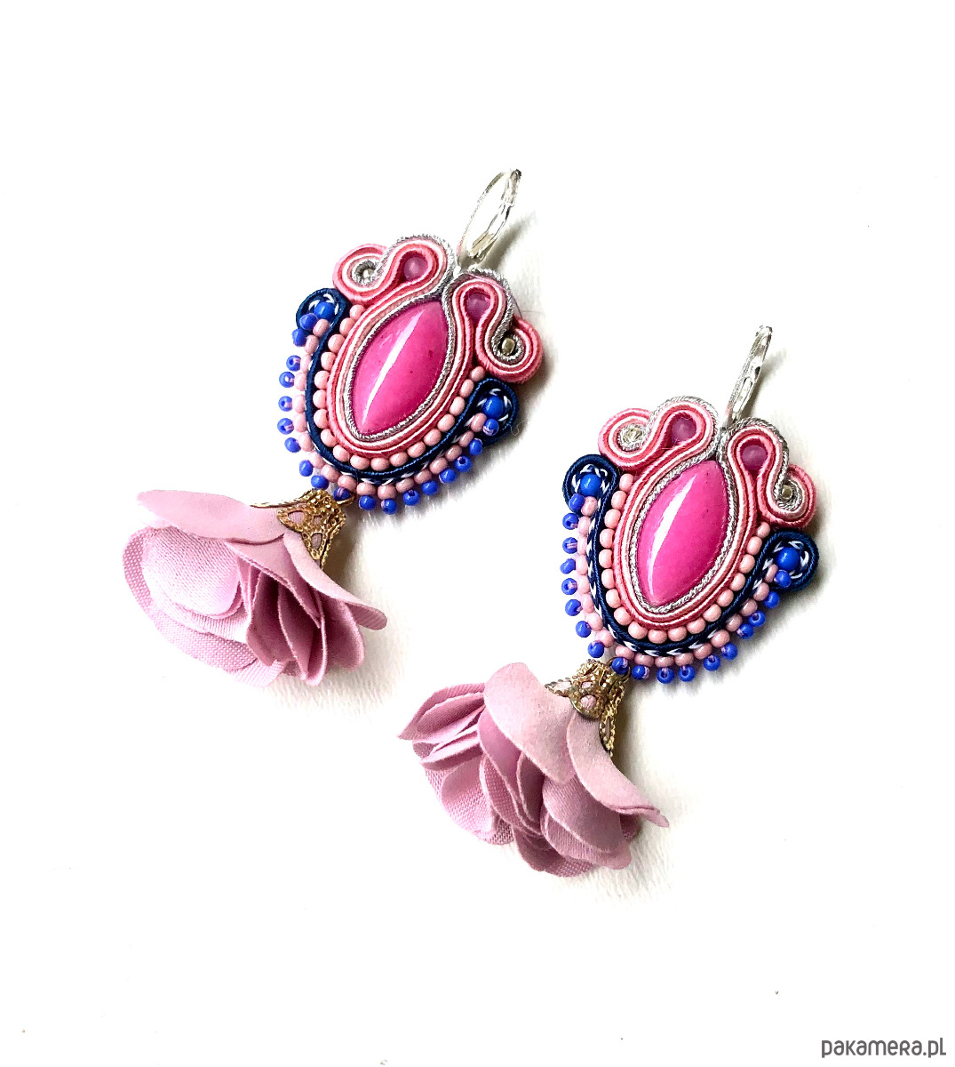 Kolczyki z sutaszu - w połączeniu jasnego różu i indygo z różowym jadeitem. Długość ok. 5-6 cm. Zawieszone na antyalergicznych biglach, możliwość wymiany na klipsy lub sztyfty. Kolczyki wykonywane na indywidualne zamówienie.