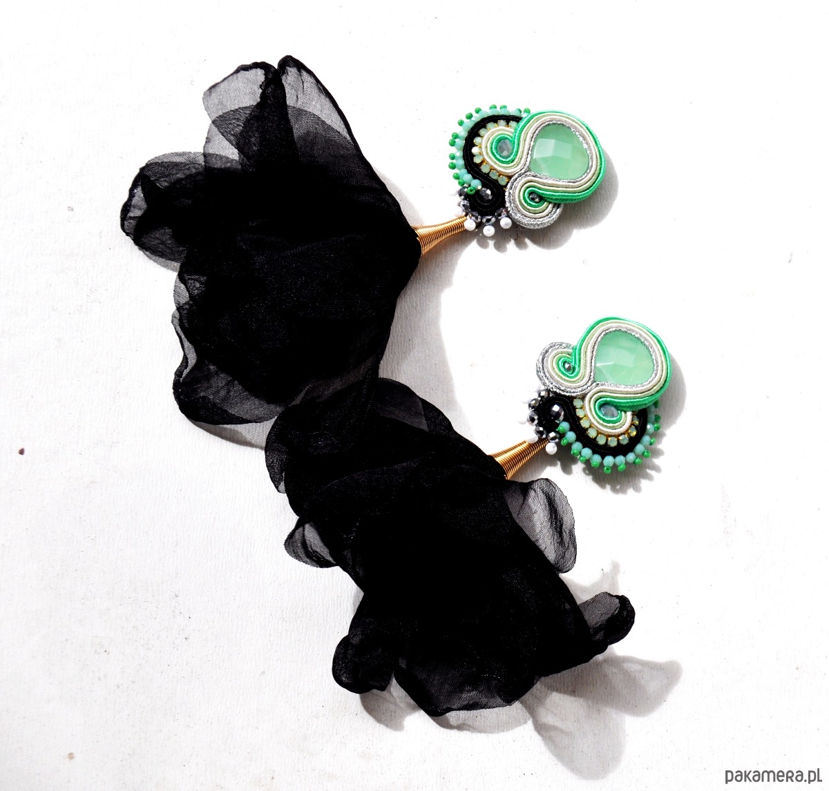 Oryginalne eleganckie kolczyki z sutaszu - w odcieniach mięty, czerni, ecru i srebra z szyfonowymi kwiatami. Długość ok. 11 cm. Zawieszone na antyalergicznych sztyftach.Impregnowane. Kolczyki wykonywane są na indywidualne zamówienie.