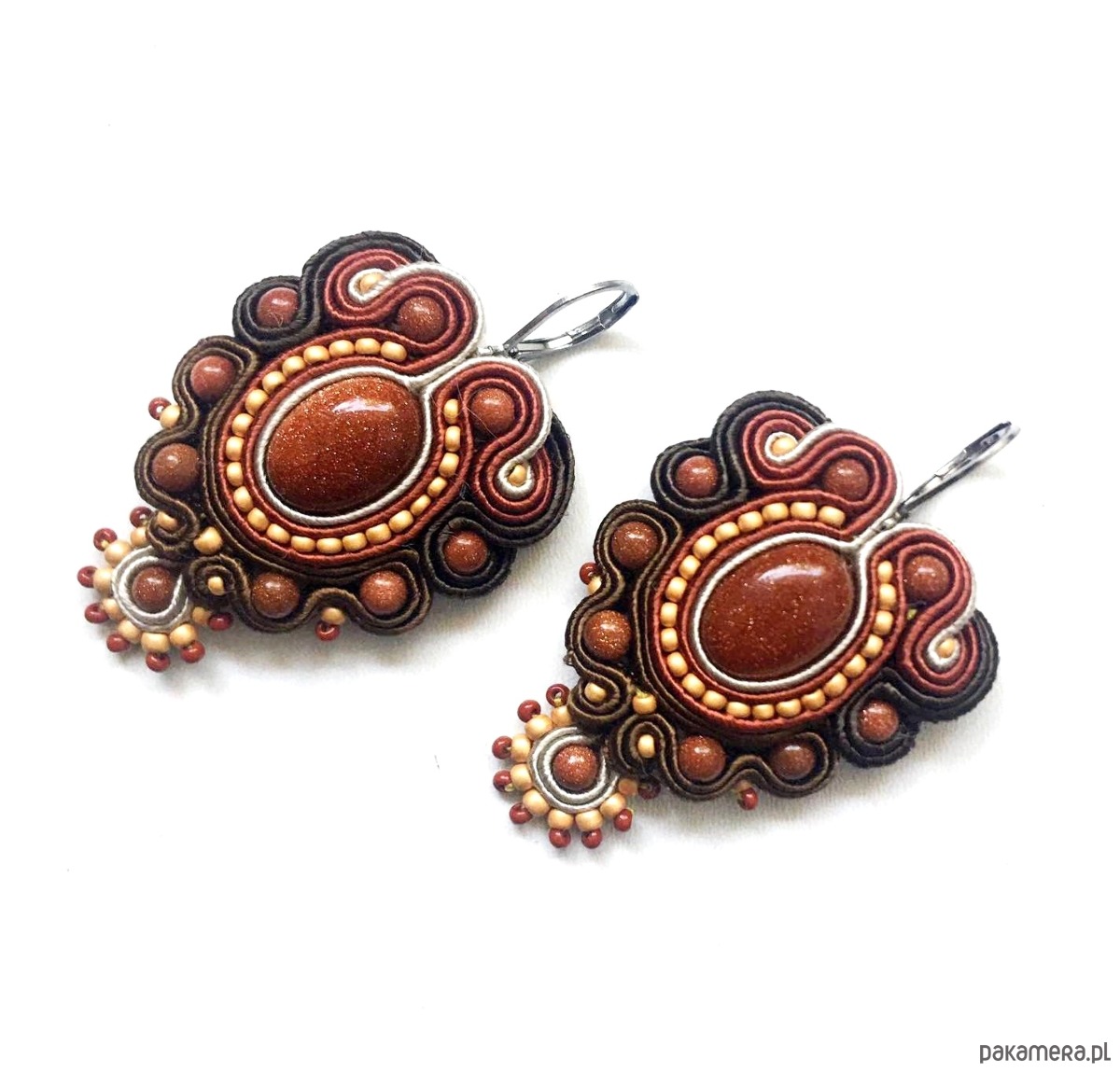 Piękne kolczyki z sutaszu - w połączeniu różnych odcieni brązu z brązowym lśniącymi kamieniem piaskiem pustyni. Długość 7 cm. Zawieszone na antyalergicznych biglach, możliwość wymiany na klipsy lub sztyfty. Kolczyki wykonywane są na indywidualne zamówienie, dlatego jeśli potrzebujesz jakiś zmian proszę to uzgodnić przed zakupem, abyśmy mogli ustalić szczegóły
