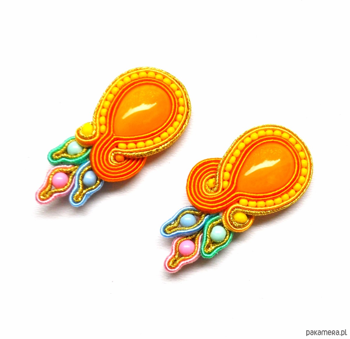 Eleganckie kolczyki z sutaszu. Kolory: niebieski, różowy, żółty. Długość 6,5 cm. Zawieszone na biglach ze stali chirurgicznej (możliwość zamiany na sztyfty). Tył wykończony ekologiczną skórą.