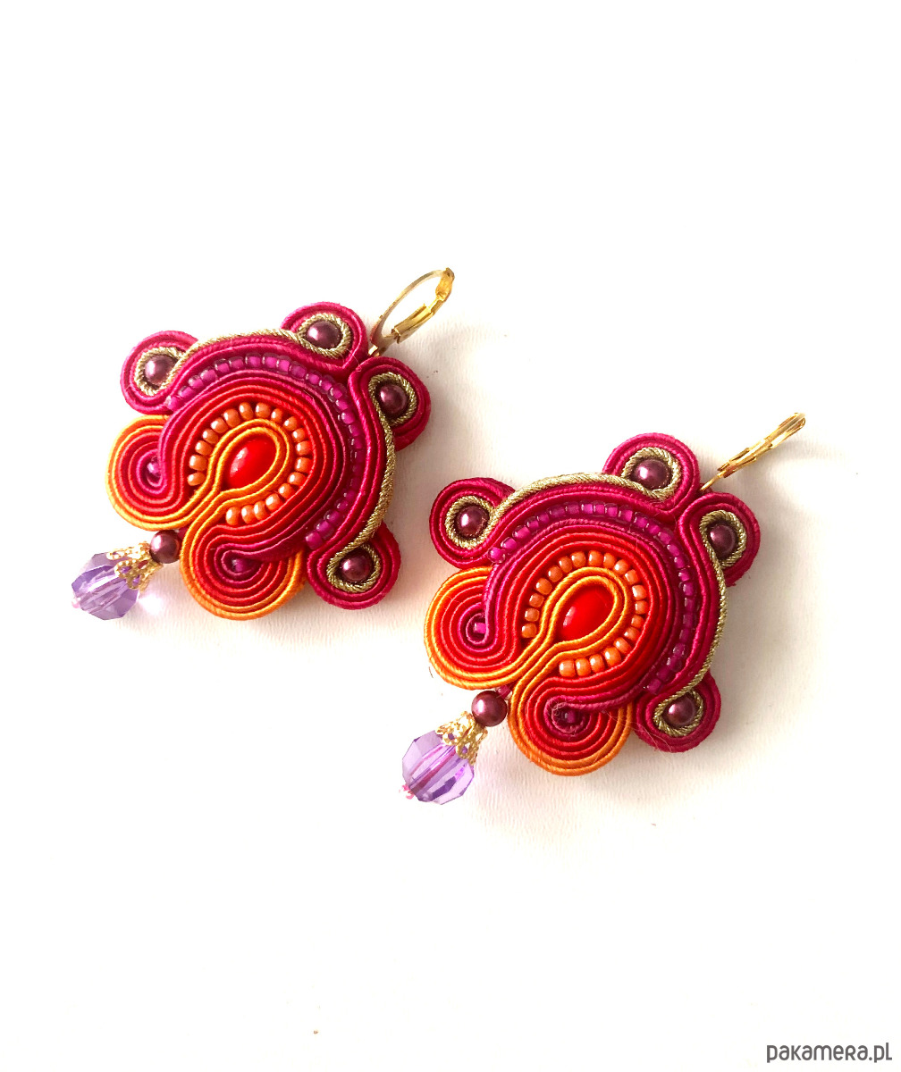 Oryginalne eleganckie kolczyki z sutaszu - w odcieniach różu, fioletu, czerwieni, pomarańczu i złota. Długość ok. 4 cm. Zawieszone na antyalergicznych biglach.Impregnowane. Kolczyki wykonywane są na indywidualne zamówienie. Proszę o przemyślane zakupy, ponieważ nie przyjmuję zwrotów.
