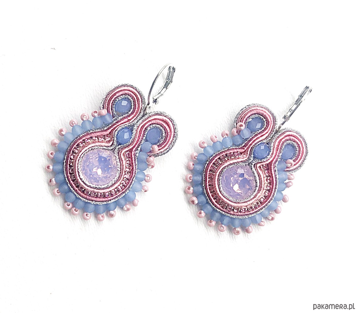 Eleganckie kolczyki w tonacji w odcieniach różu i niebieskiego i złota z jasnoróżowym fasetowanym kaboszonem. Długość ok. 4 cm. Kolczyki wykonywane na indywidualne zamówienie.