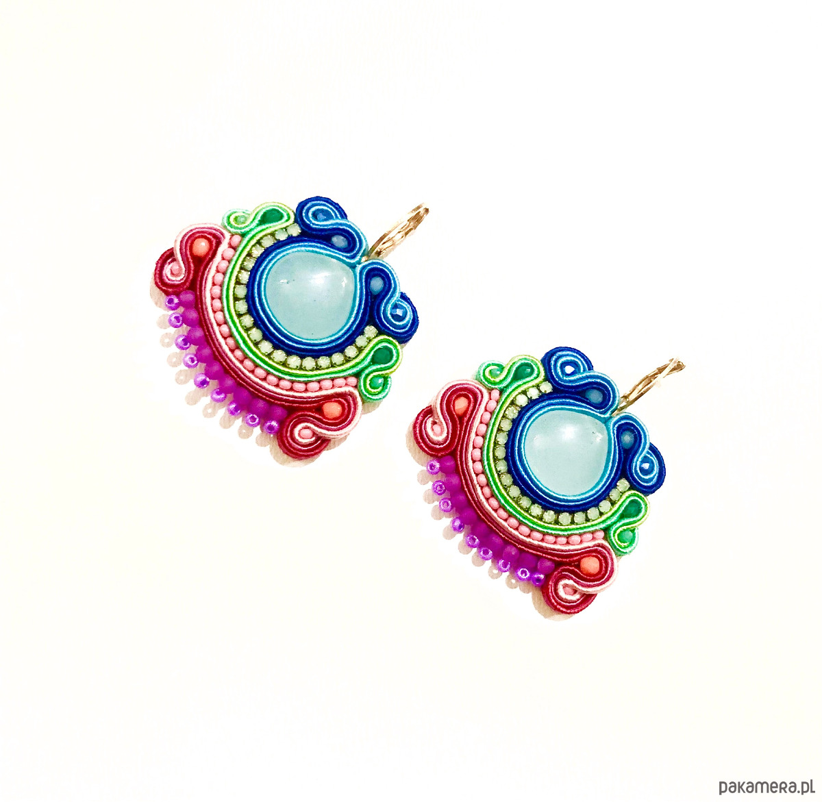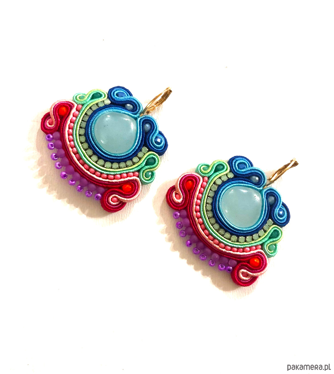 Eleganckie kolczyki w tonacji: różu, fioletu, zieleni, turkusu z błękitnym jadeitem. Długość ok. 5 cm. Bigle antyalergiczne. Kolczyki wykonywane na indywidualne zamówienie - możliwość zmian kolorystycznych.