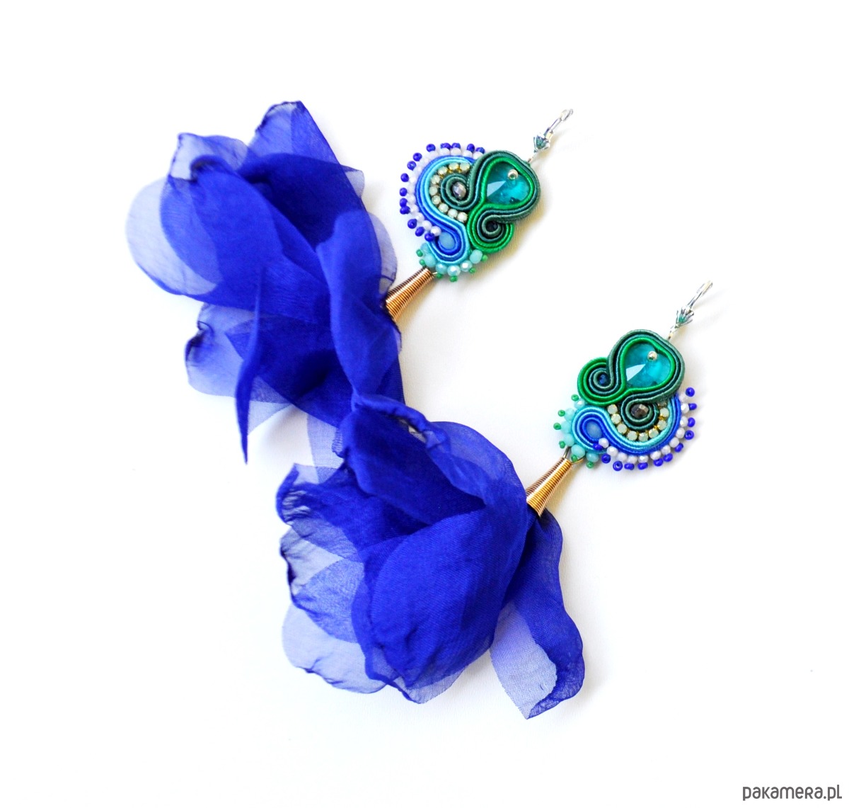 Oryginalne eleganckie kolczyki z sutaszu - w odcieniach: szmaragdu, szafiru, niebieskiego i zieleni z szyfonowymi kwiatami w kolorze chabrowym. Długość 11 cm. Zawieszone na antyalergicznych biglach.Impregnowane. Kolczyki wykonywane są na indywidualne zamówienie.