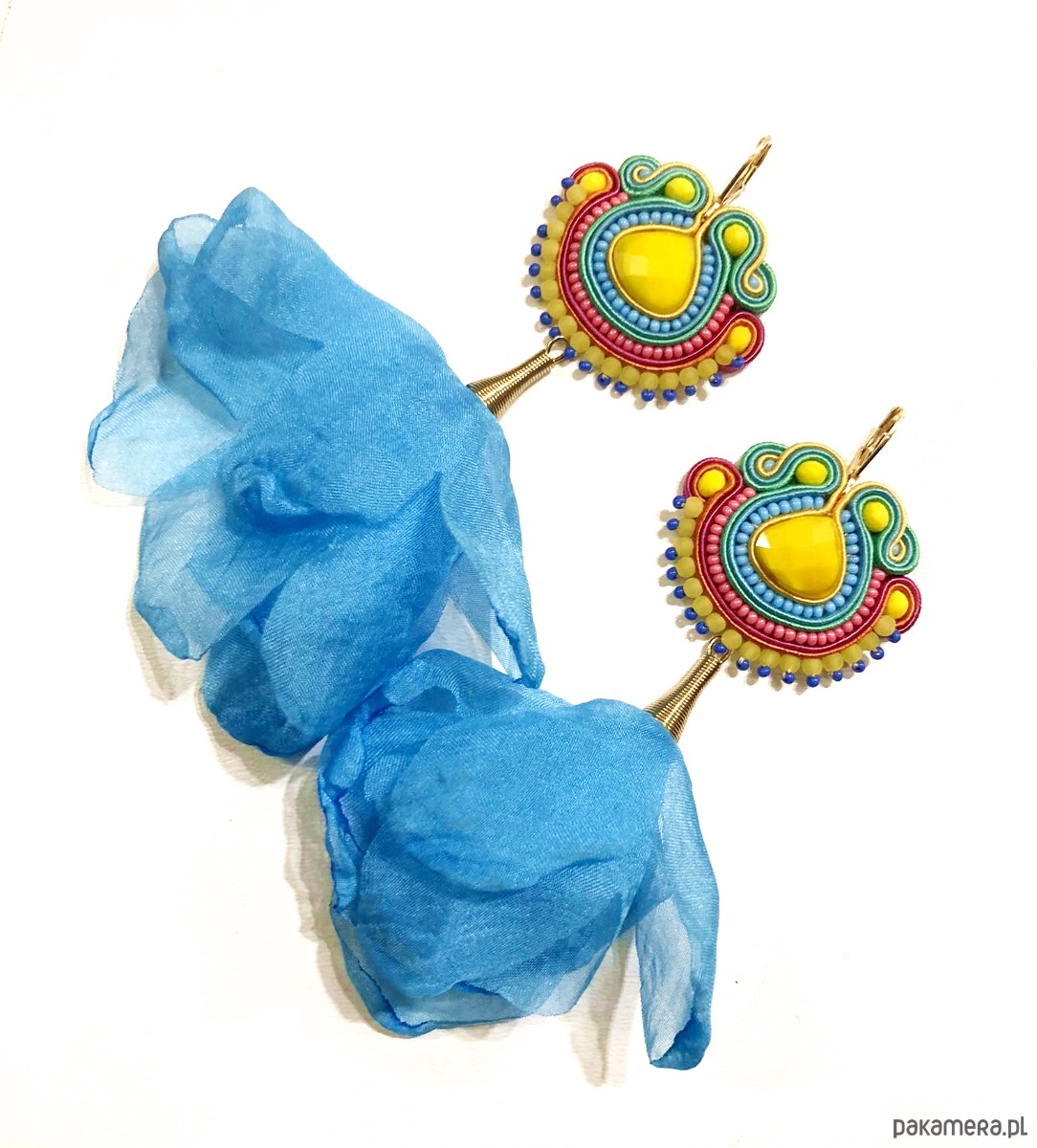 Kolczyki z sutaszu - w połączeniu żółtego, różu, pomarańczu, zieleni, turkusu z niebieskimi kwiatami. Długość ok. 9 cm. Zawieszone na antyalergicznych biglach, możliwość wymiany na klipsy lub sztyfty. Kolczyki wykonywane na indywidualne zamówienie.