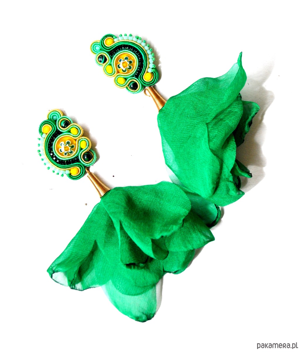 Oryginalne eleganckie kolczyki z sutaszu - w odcieniach zieleni z szyfonowymi kwiatami w kolorze szmaragdowej zieleni. Długość ok. 11 cm. Zawieszone na antyalergicznych sztyftach.Impregnowane. Kolczyki wykonywane są na indywidualne zamówienie.