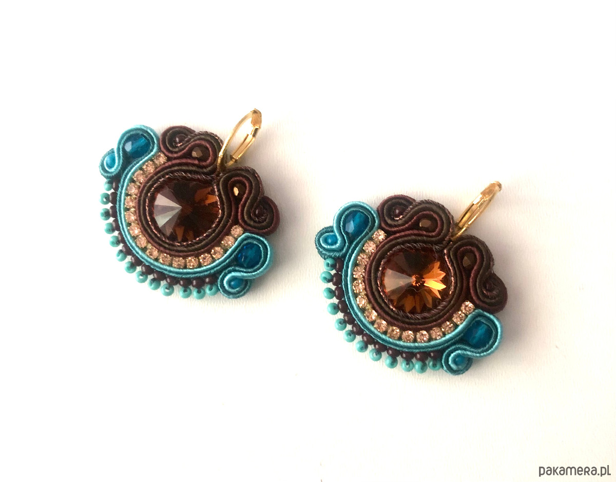 Oryginalne eleganckie kolczyki z sutaszu - w odcieniach turkusu i brązu. Długość ok. 3 cm. Zawieszone na antyalergicznych sztyftach.Impregnowane. Kolczyki wykonywane są na indywidualne zamówienie.