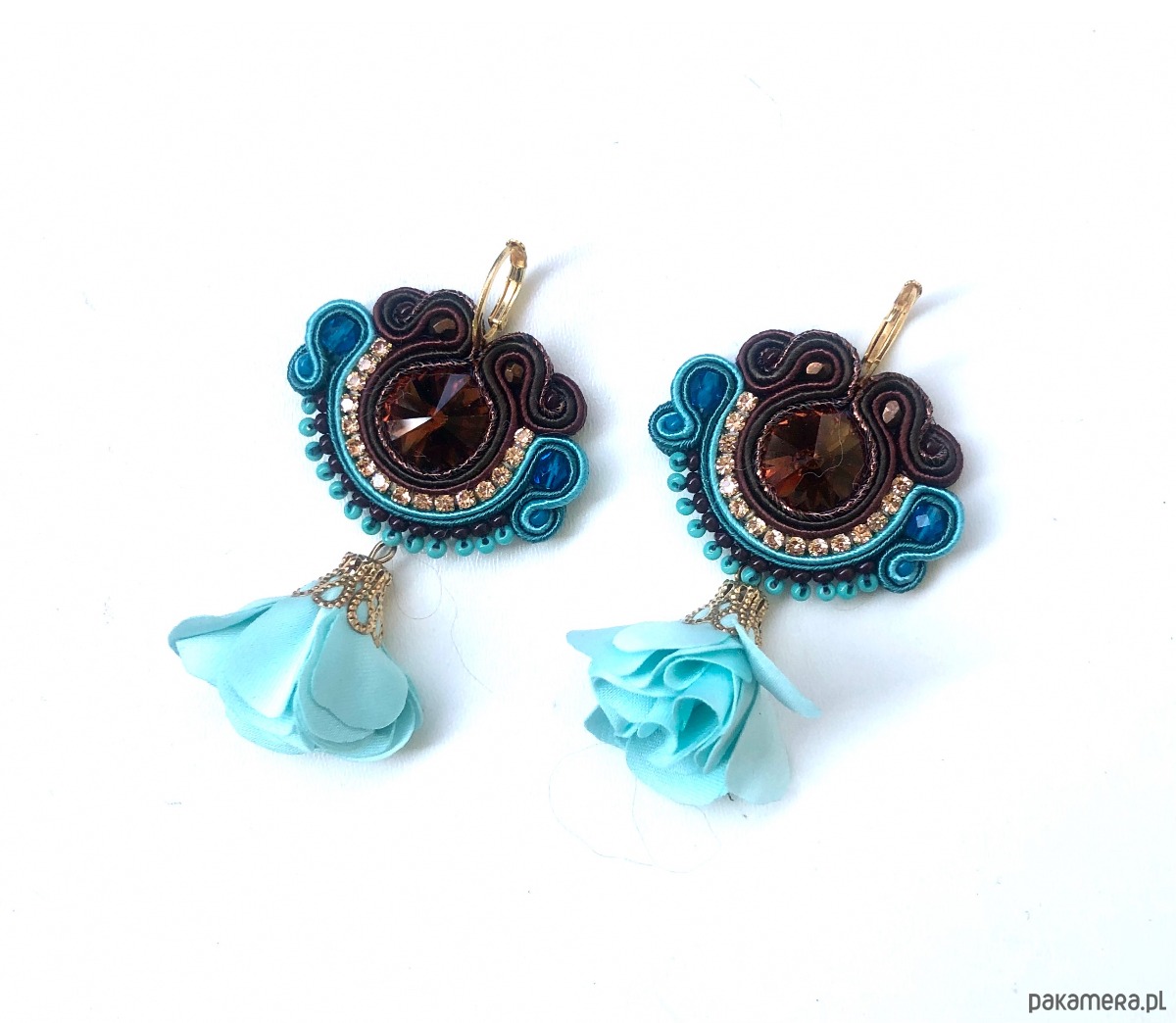 Oryginalne eleganckie kolczyki z sutaszu - w odcieniach turkusu i brązu z morskimi kwiatami. Środek to rivoli swarovskiego w kolorze brązowym. Długość ok. 6 cm. Zawieszone na antyalergicznych sztyftach.Impregnowane. Kolczyki wykonywane są na indywidualne zamówienie. Idealnie pasują do codziennych stylizacji i na wyjścia.