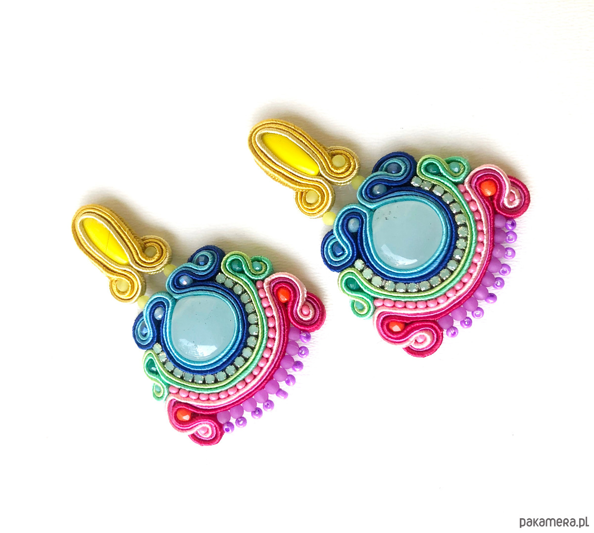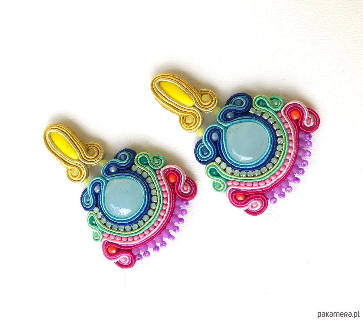 Eleganckie kolczyki w tonacji w odcieniach żółtego, różu, zieleni, niebieskiego z niebieskim jadeitem. Długość ok. 9 cm. Sztyfty z kuleczką antyalergiczne. Kolczyki wykonywane na indywidualne zamówienie.