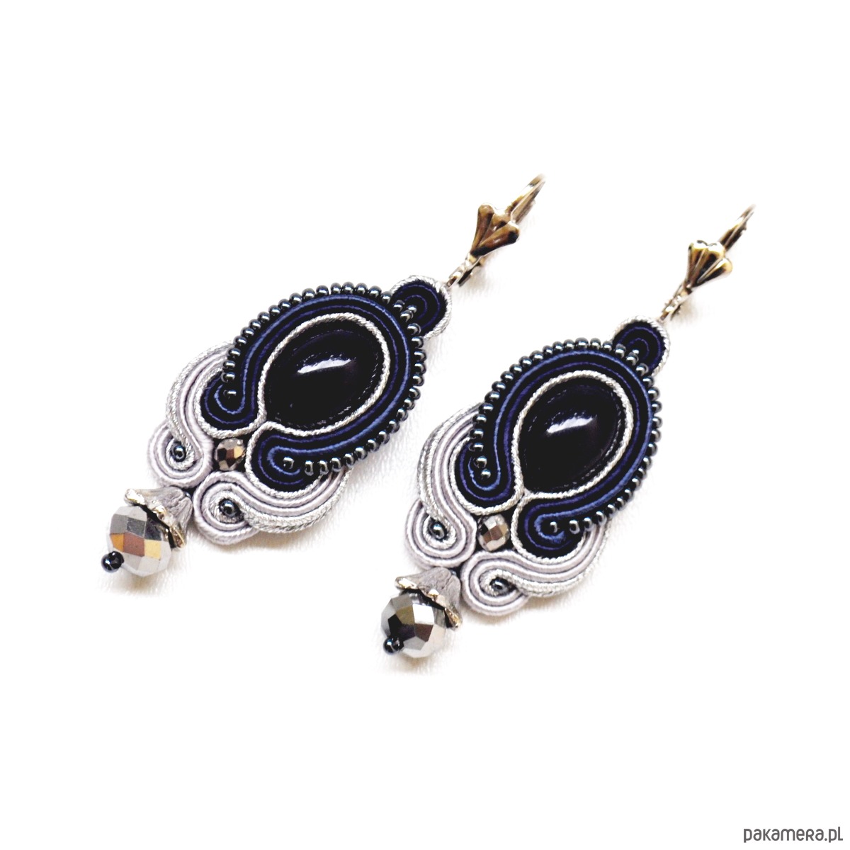 Eleganckie kolczyki w tonacji granatu, szarości i srebra. Długość 4,5 cm. Bigle antyalergiczne. Możliwość wymiany na klipsy lub sztyfty. Kolczyki robione na indywidualne zamówienie.