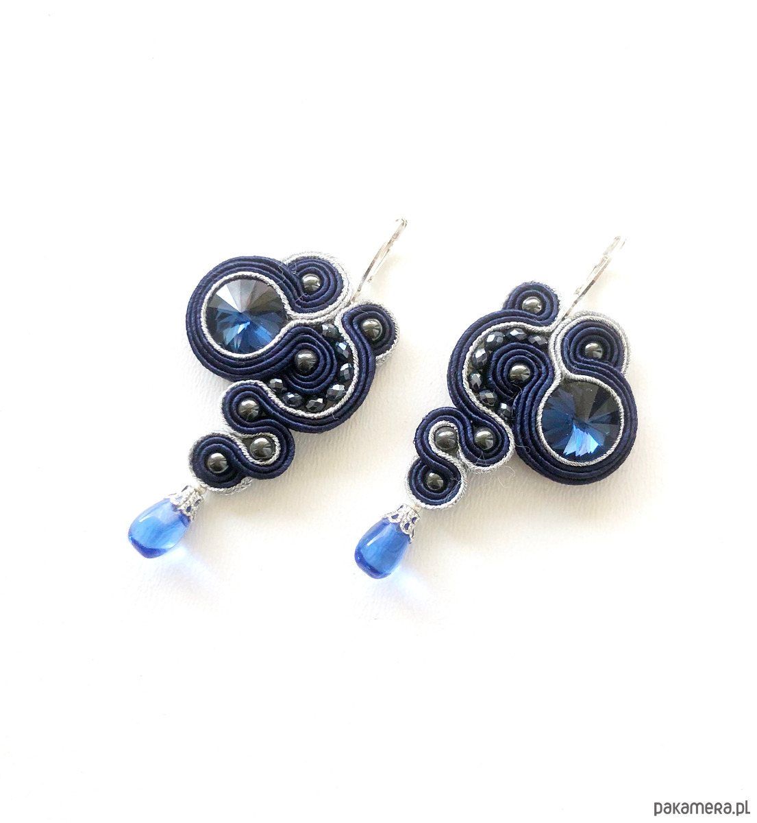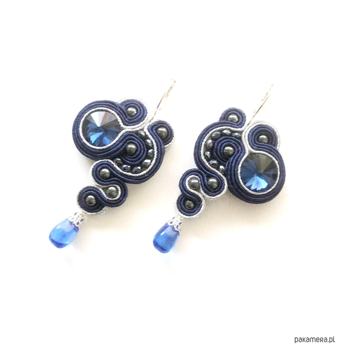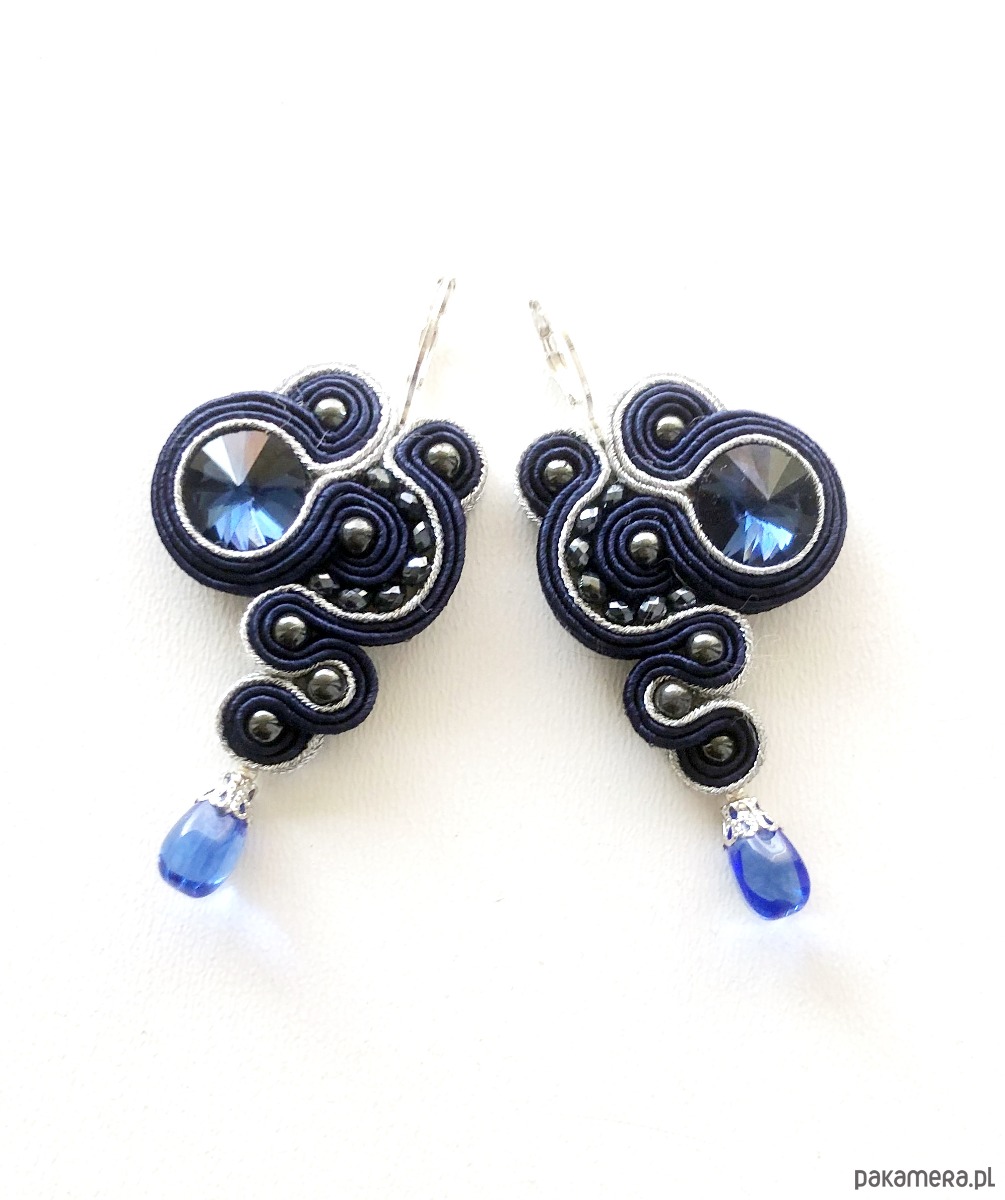 Kolczyki z sutaszu - w połączeniu granatu i srebra. Długość 6 cm. Zawieszone na antyalergicznych biglach, możliwość wymiany na klipsy lub sztyfty. Kolczyki wykonywane na indywidualne zamówienie, w związku z czym nie ma możliwości zwrotu.