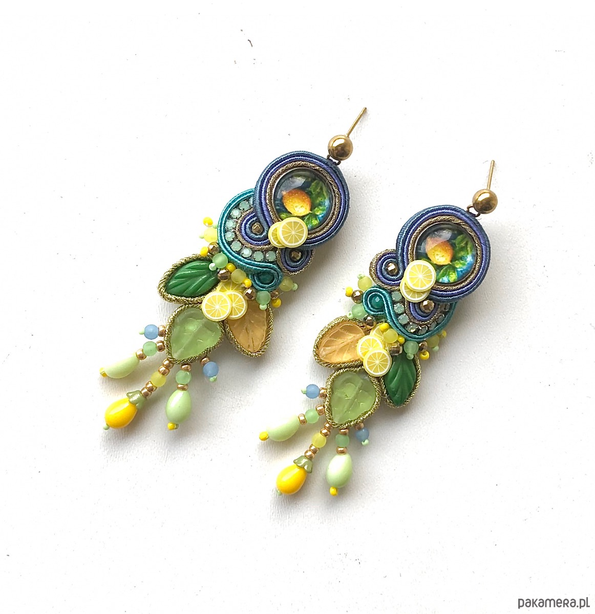 Długie, bogato zdobione kolczyki w odcieniach: zieleni, niebieskiego, żółtego i złota z kaboszonami z cytrynami. Na dole małe szklane koraliki. Zdobione maleńkimi cytrynami. Długość ok. 8 cm. Zawieszone na antyalergicznych sztyftach. Możliwość wymiany na bigle. Kolczyki robione są na indywidualne zamówienie.