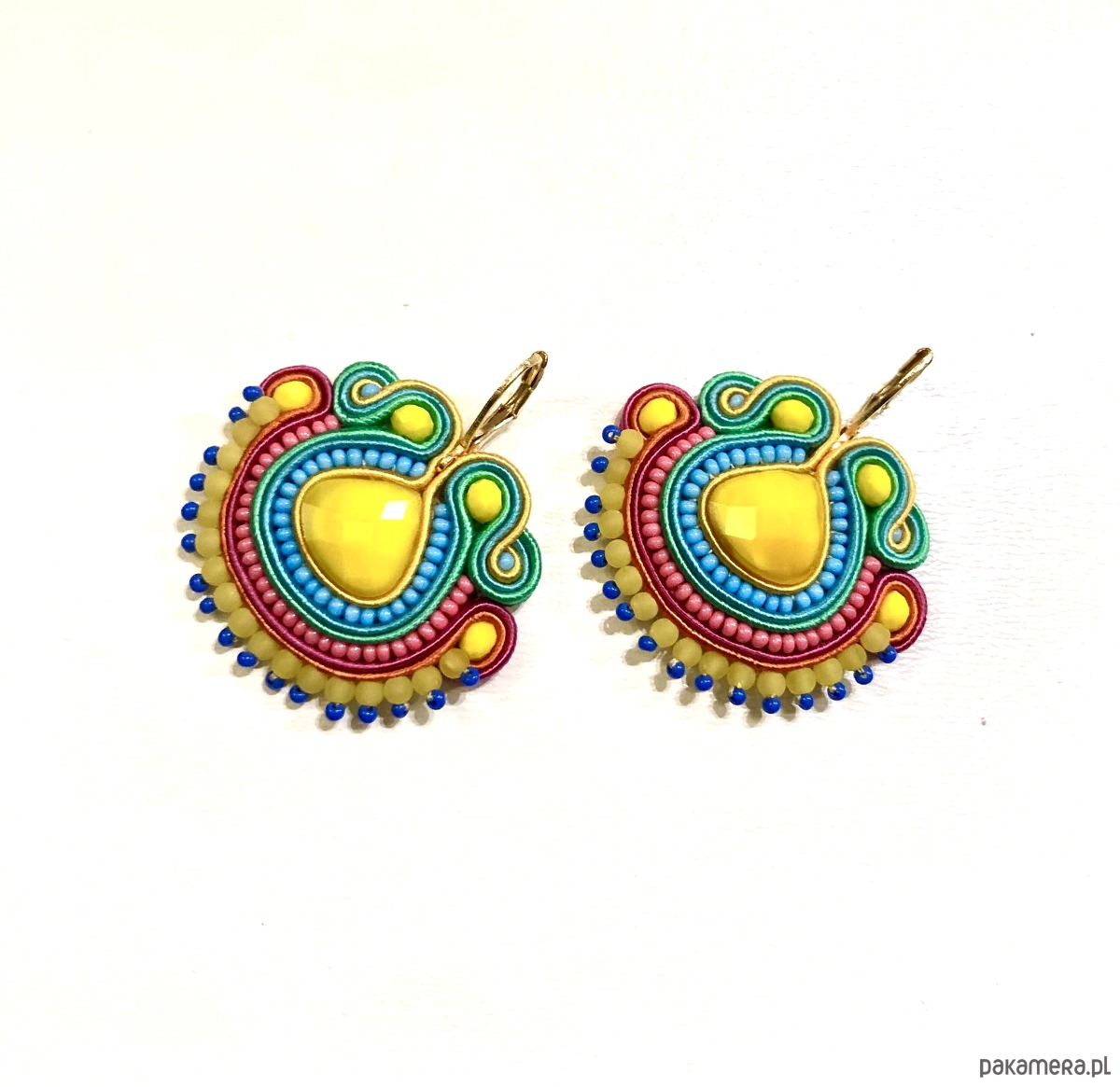 Eleganckie kolczyki w tonacji w odcieniach żółtego, pomarańczu, czerwieni, różu, zieleni, niebieskiego i złota z żółtym fasetowanym kaboszonem. Długość ok. 4 cm. Sztyfty z kuleczką antyalergiczne. Kolczyki wykonywane na indywidualne zamówienie.