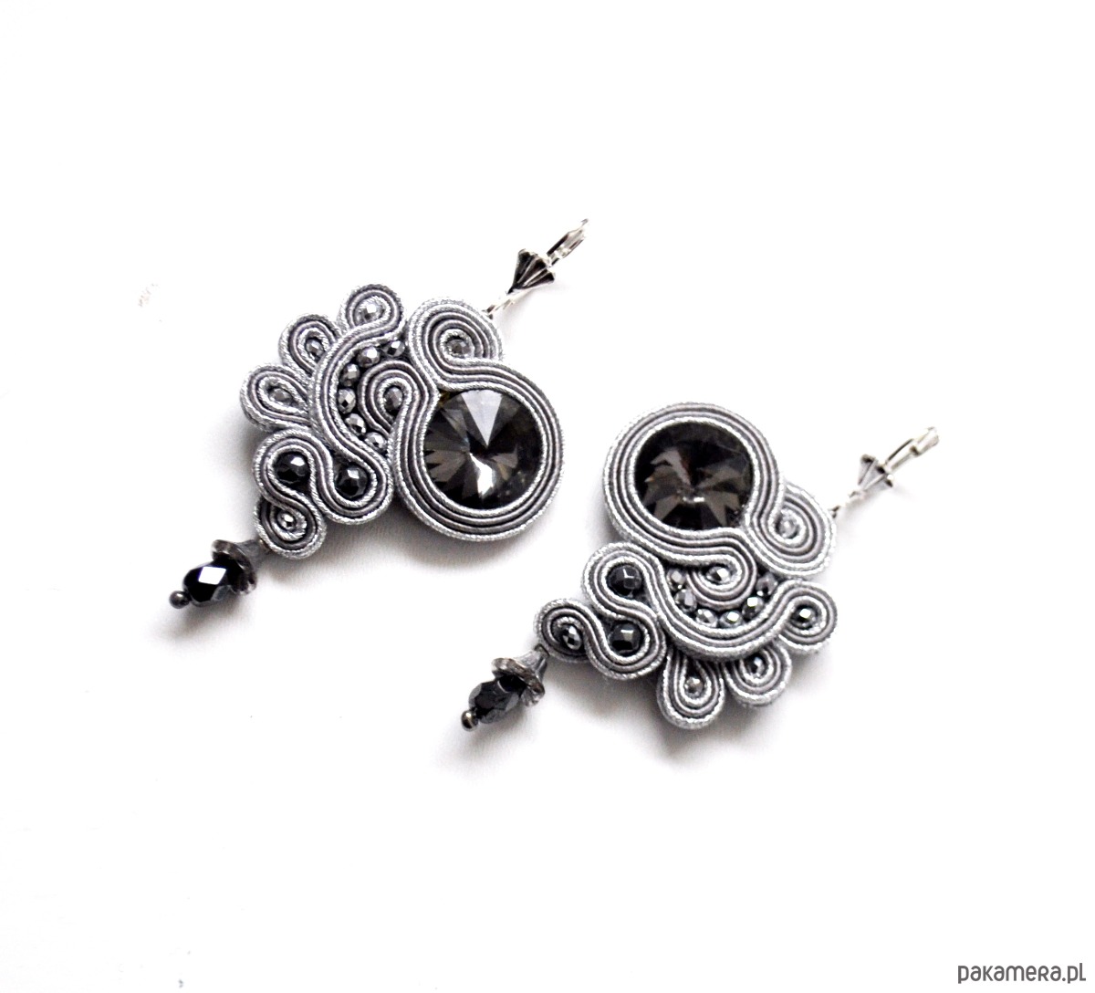 Kolczyki z sutaszu - w połączeniu szarości i srebra. Długość 6 cm. Zawieszone na antyalergicznych biglach, możliwość wymiany na klipsy lub sztyfty. Kolczyki wykonywane na indywidualne zamówienie, w związku z czym nie ma możliwości zwrotu.