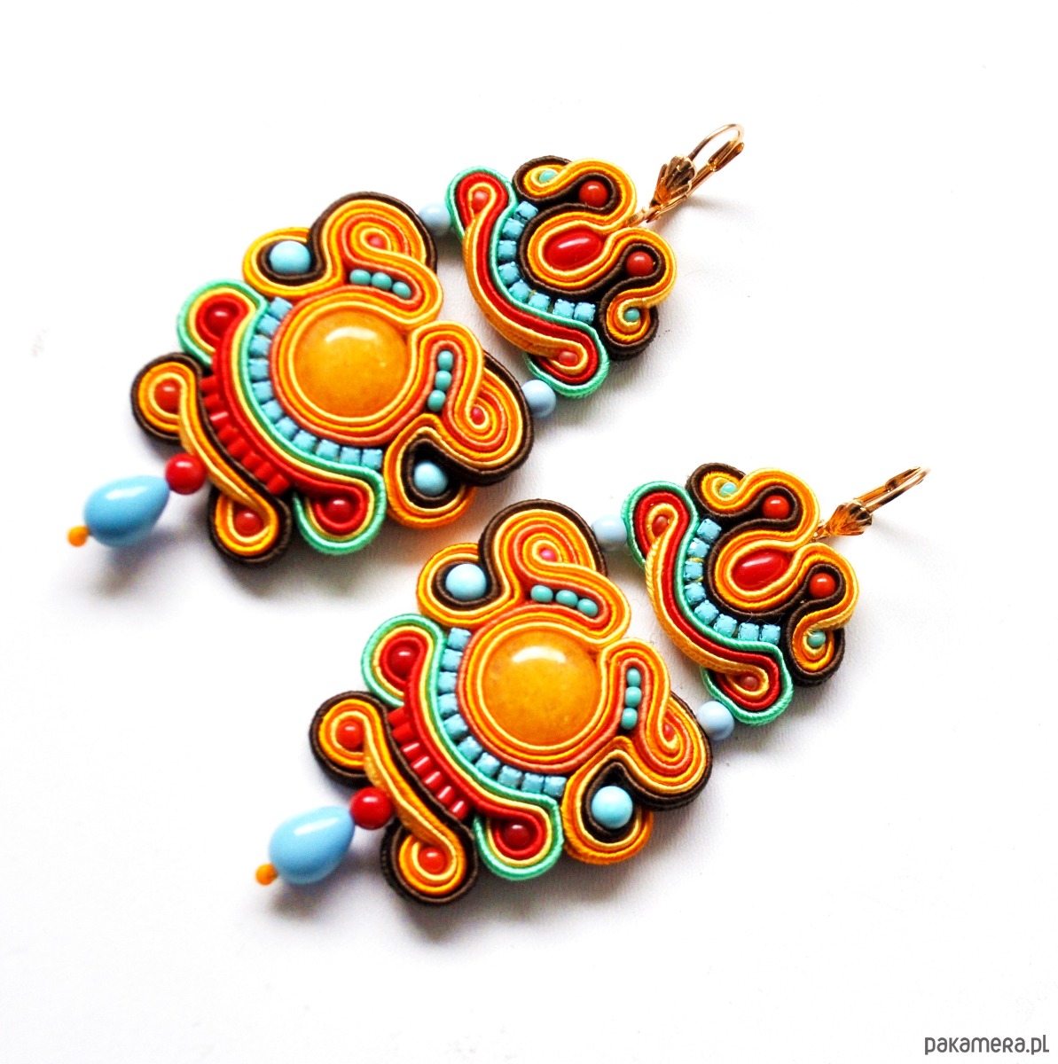 Eleganckie kolczyki z sutaszu w odcieniach żółtego, pomarańczu, czerwieni, zieleni, turkusu, brązu i mięty. Długość: 8,5 cm. Zawieszone na antyalergicznych biglach (możliwość zamiany na sztyfty). Tył wykończony ekologiczną skórą. Kolczyki robione na indywidualne zamówienie.