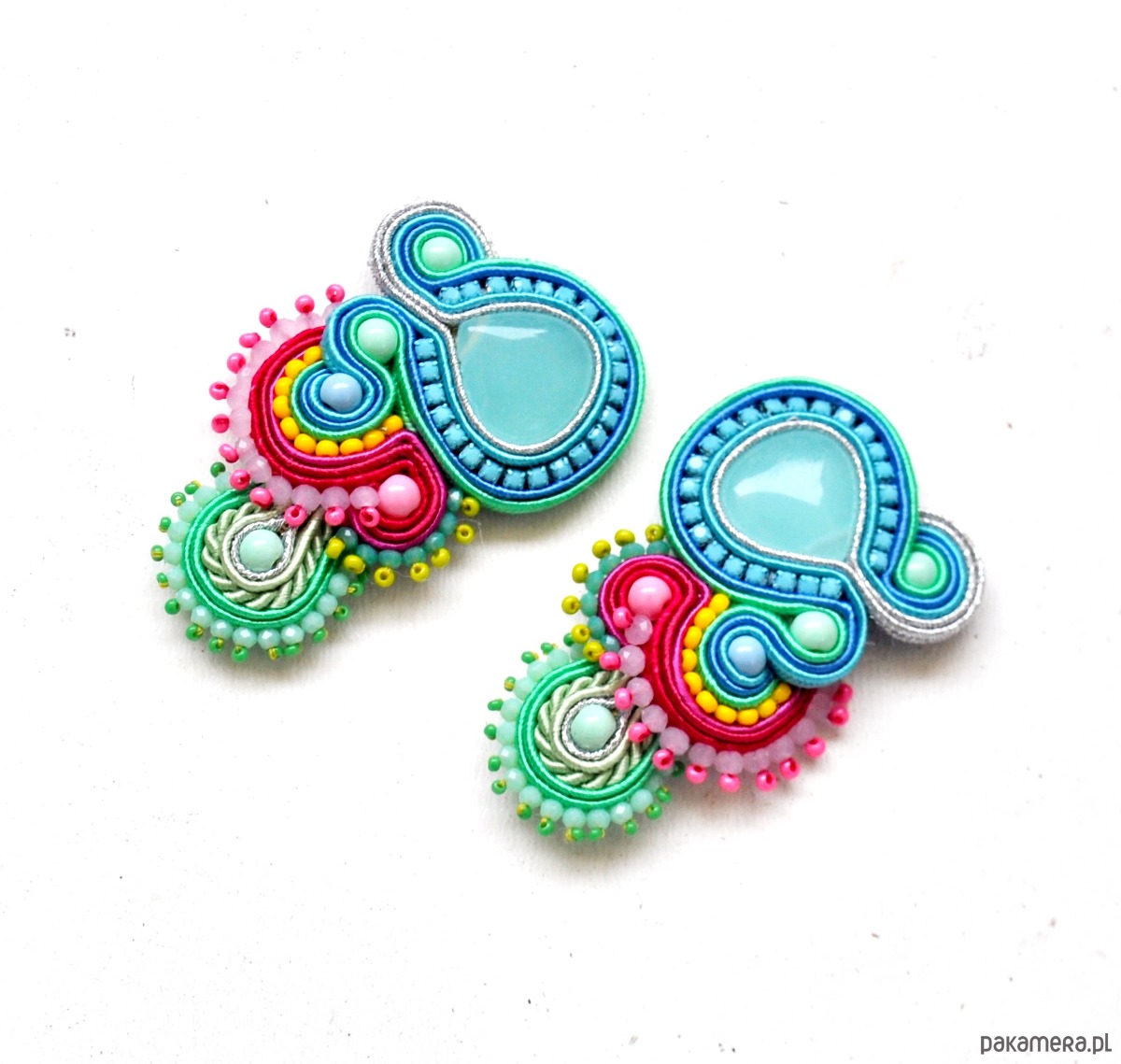 Kolczyki z sutaszu - w połączeniu różu, turkusu, błękitu, zieleni i srebra. Długość 6 cm. Zawieszone na antyalergicznych biglach, możliwość wymiany na klipsy lub sztyfty. Kolczyki wykonywane na indywidualne zamówienie.