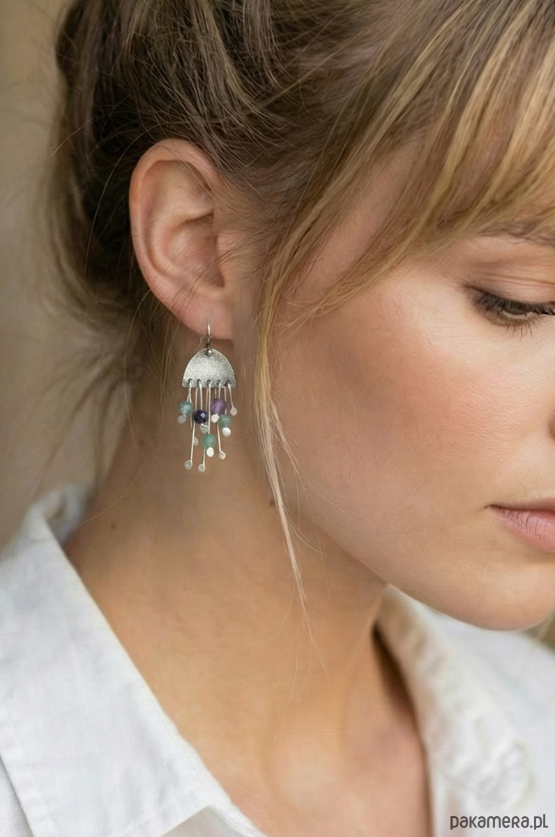 Kolczyki wykonane z fakturowanego, oksydowanego, polerowanego srebra i naturalnych kamieni.