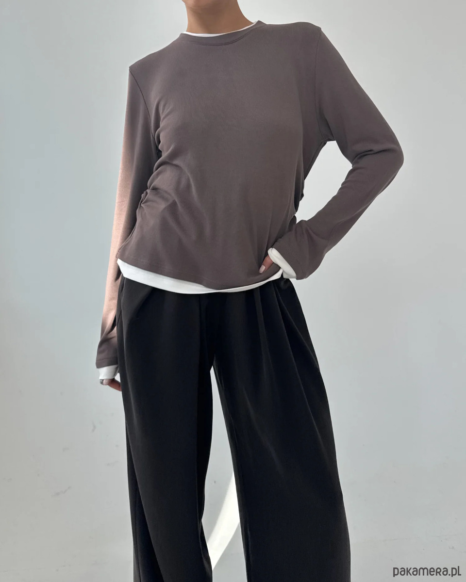 Delikatne drapowanie w talii nadaje mu asymetrii i kobiecego charakteru, optycznie podkreślając figurę. Dodatkowo wszyte pliski przy rękawach i przy szyi tworzą efekt 3D – jakby pod spodem znajdowała się druga warstwa. Ten zabieg wprowadza lekkość, rozjaśnia stylizację i sprawia, że longsleeve nabiera architektonicznego, nowoczesnego sznytu.