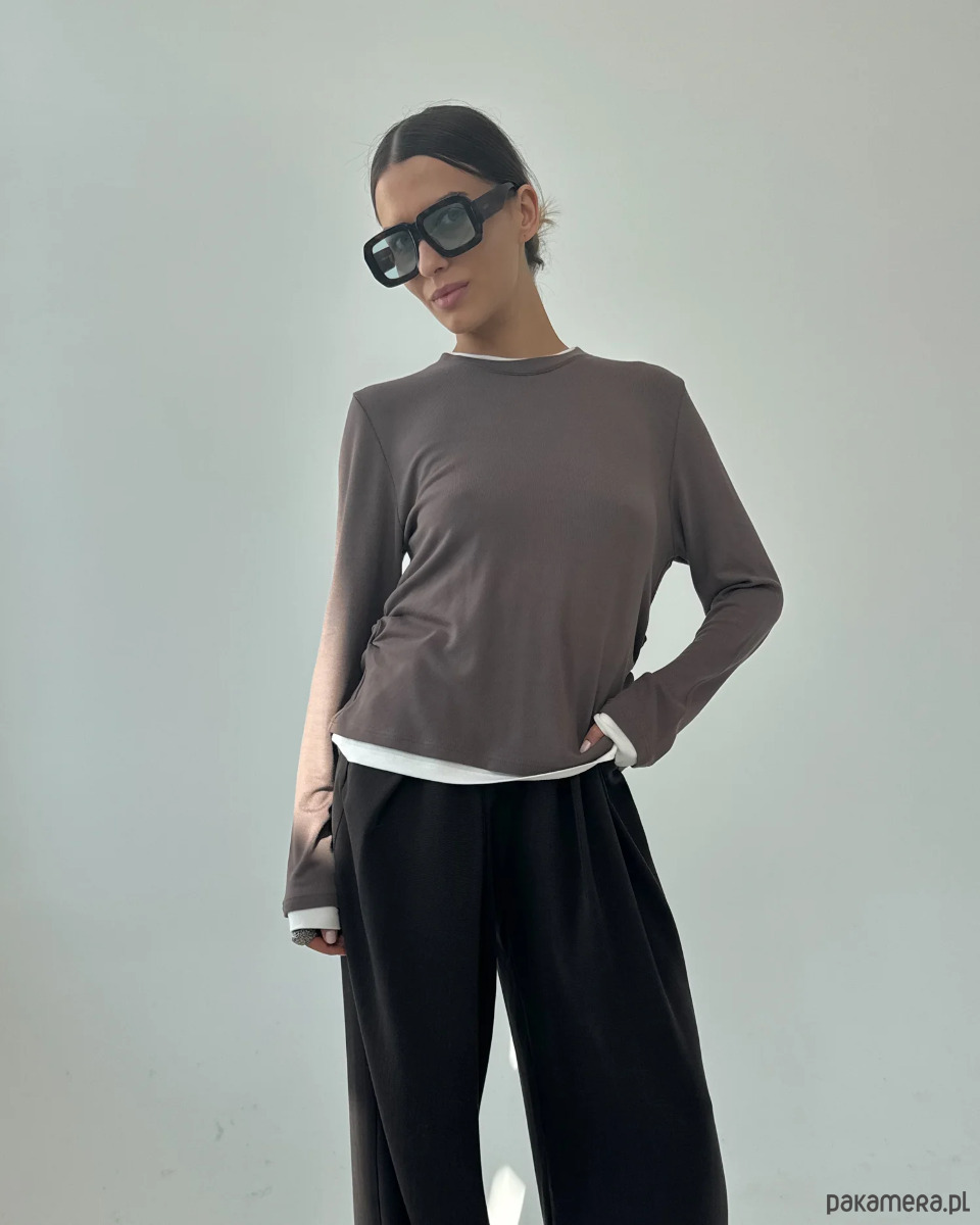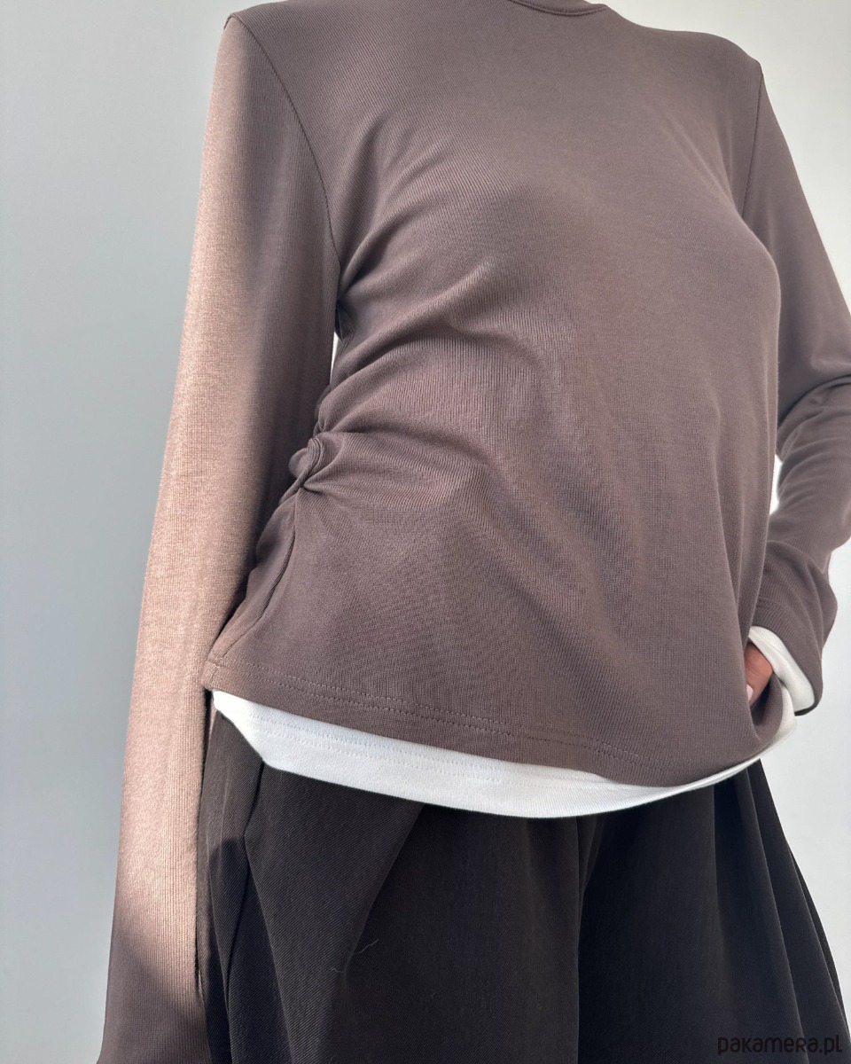Sweater Touch w kolorze cacao to lekki, miękki longsleeve o sweterkowym wykończeniu, który łączy wygodę z awangardową formą. Uszyty z wysokogatunkowej, oddychającej wiskozy, otula sylwetkę, a dzięki subtelnym detalom wyróżnia się na tle klasycznych bazowych modeli.