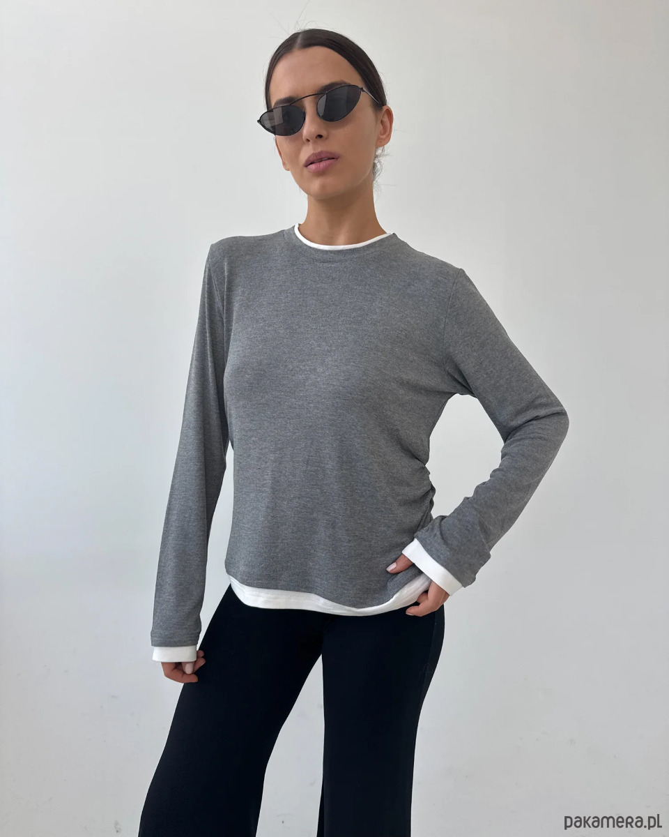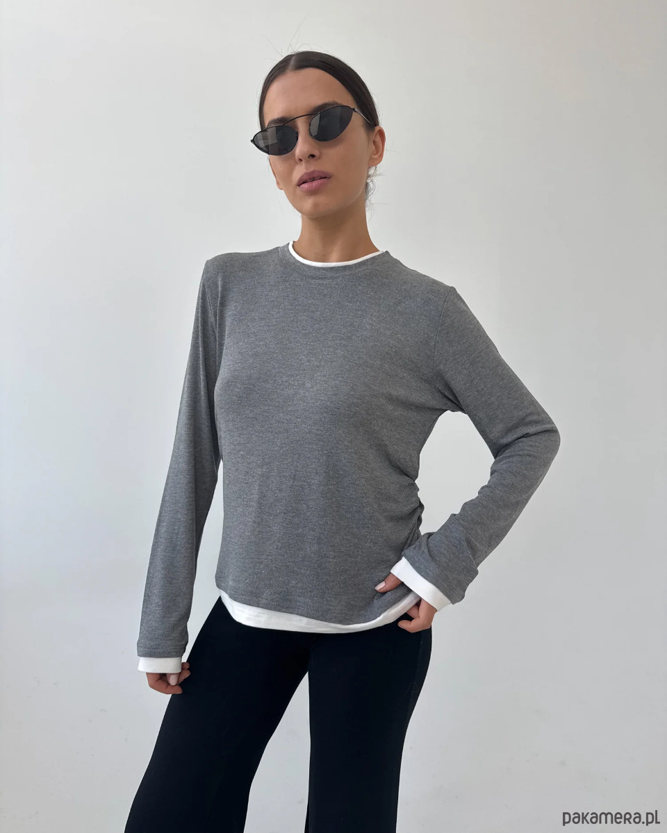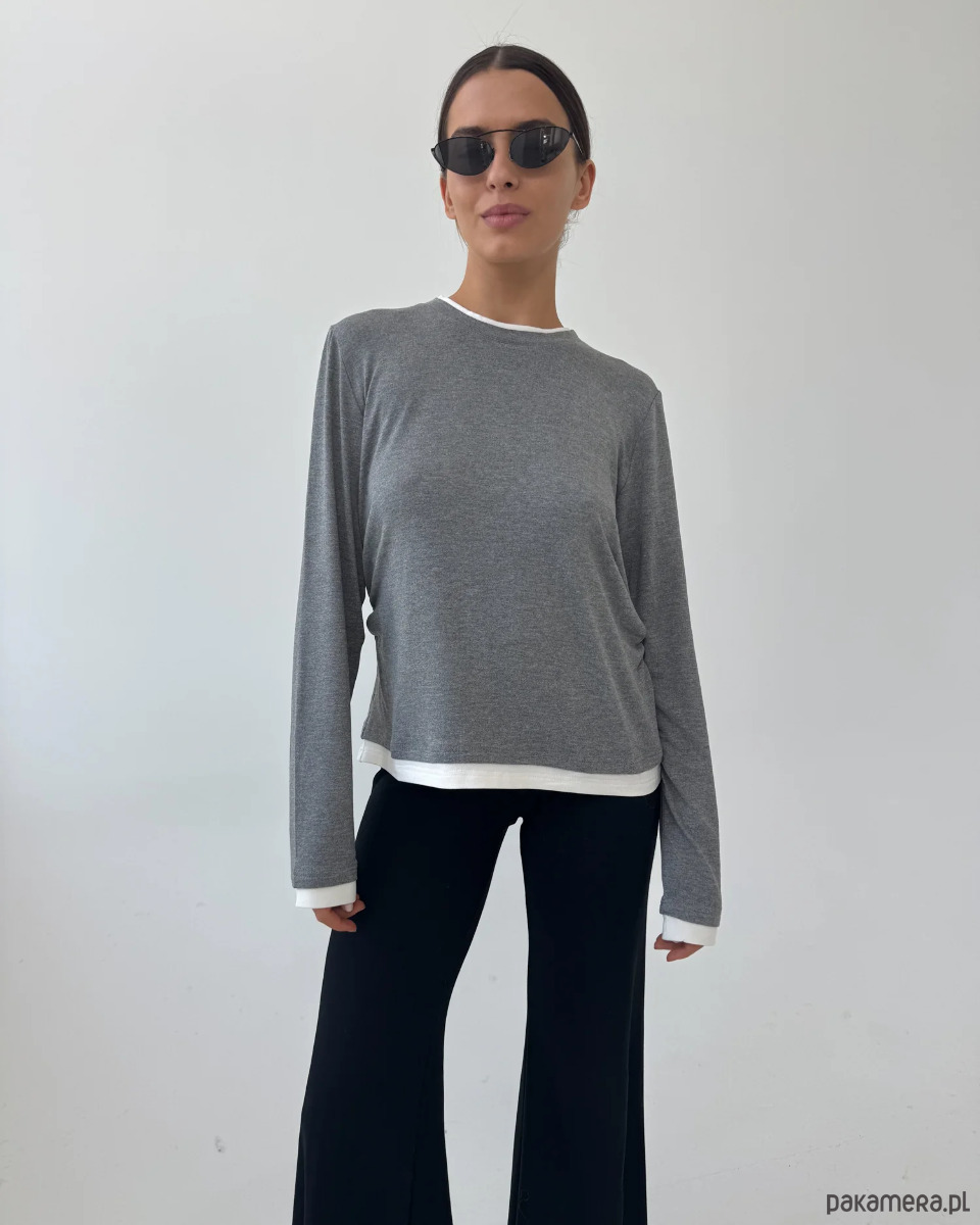 Delikatne drapowanie w talii nadaje mu asymetrii i kobiecego charakteru, optycznie podkreślając figurę. Dodatkowo wszyte pliski przy rękawach i przy szyi tworzą efekt 3D – jakby pod spodem znajdowała się druga warstwa. Ten zabieg wprowadza lekkość, rozjaśnia stylizację i sprawia, że longsleeve nabiera architektonicznego, nowoczesnego sznytu.