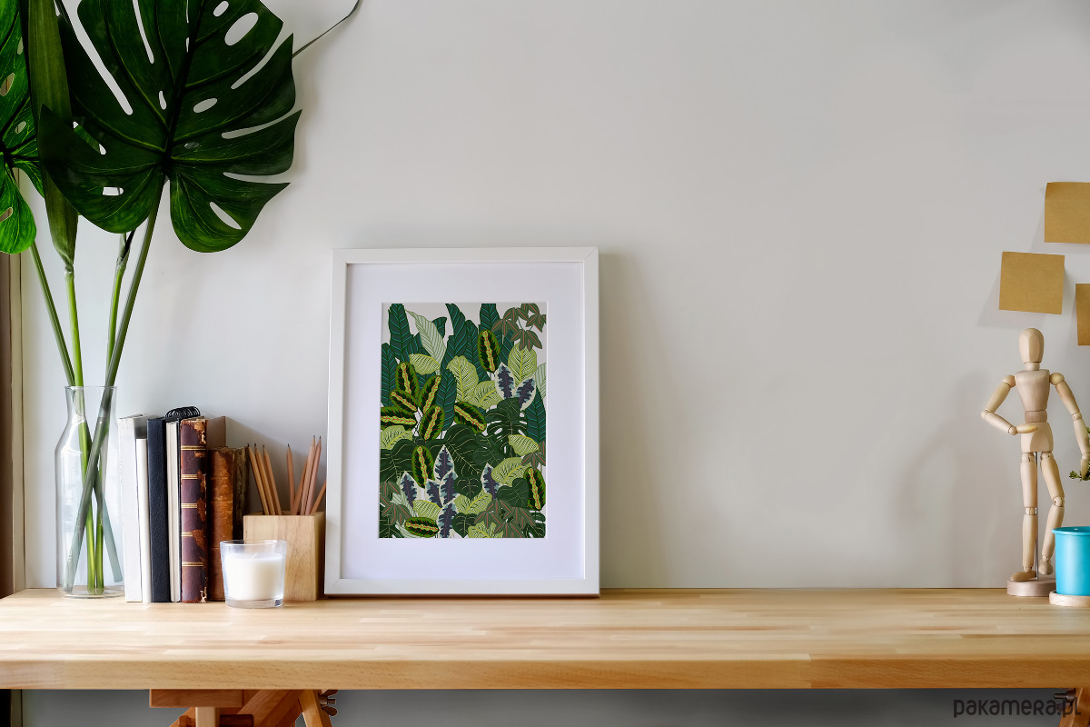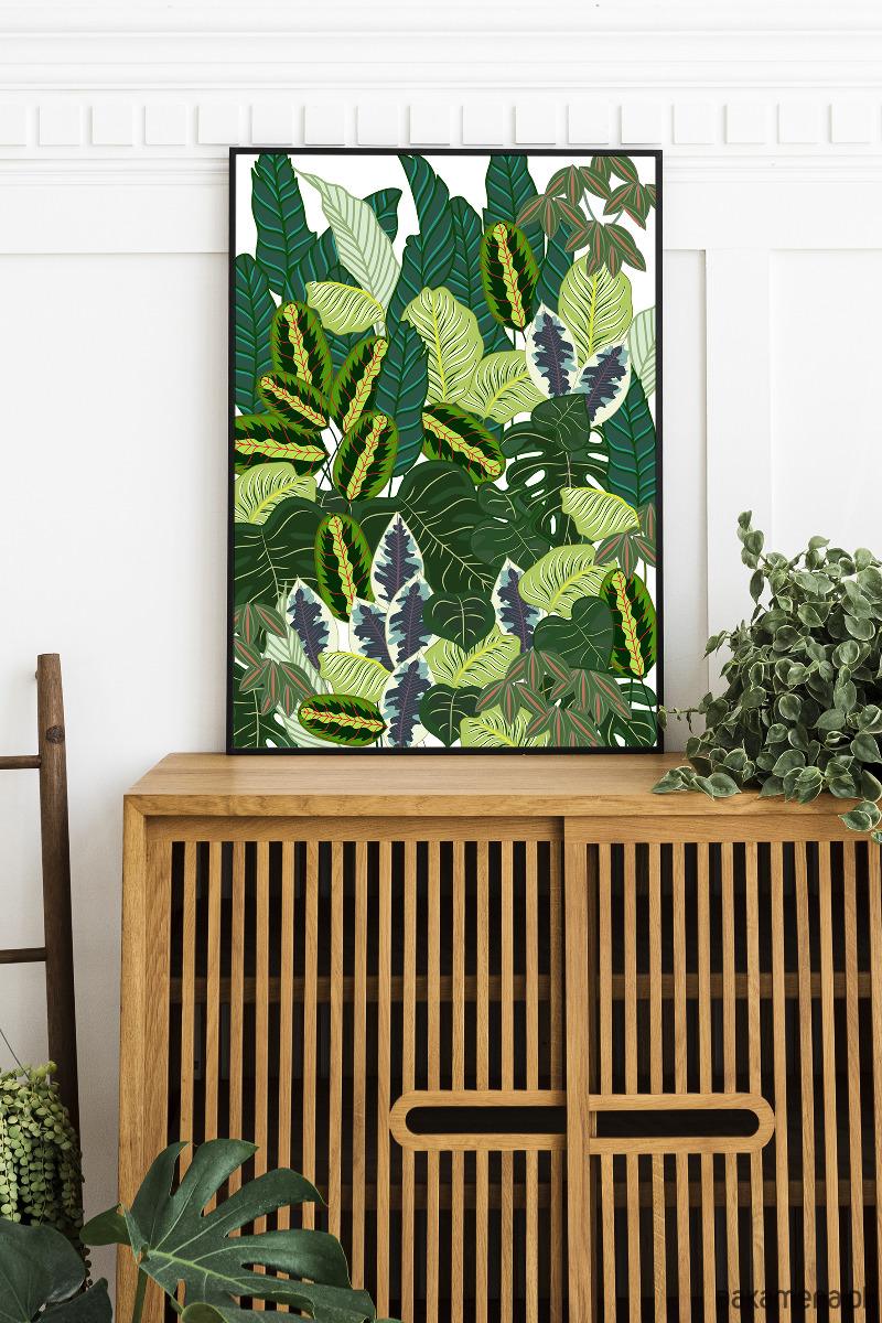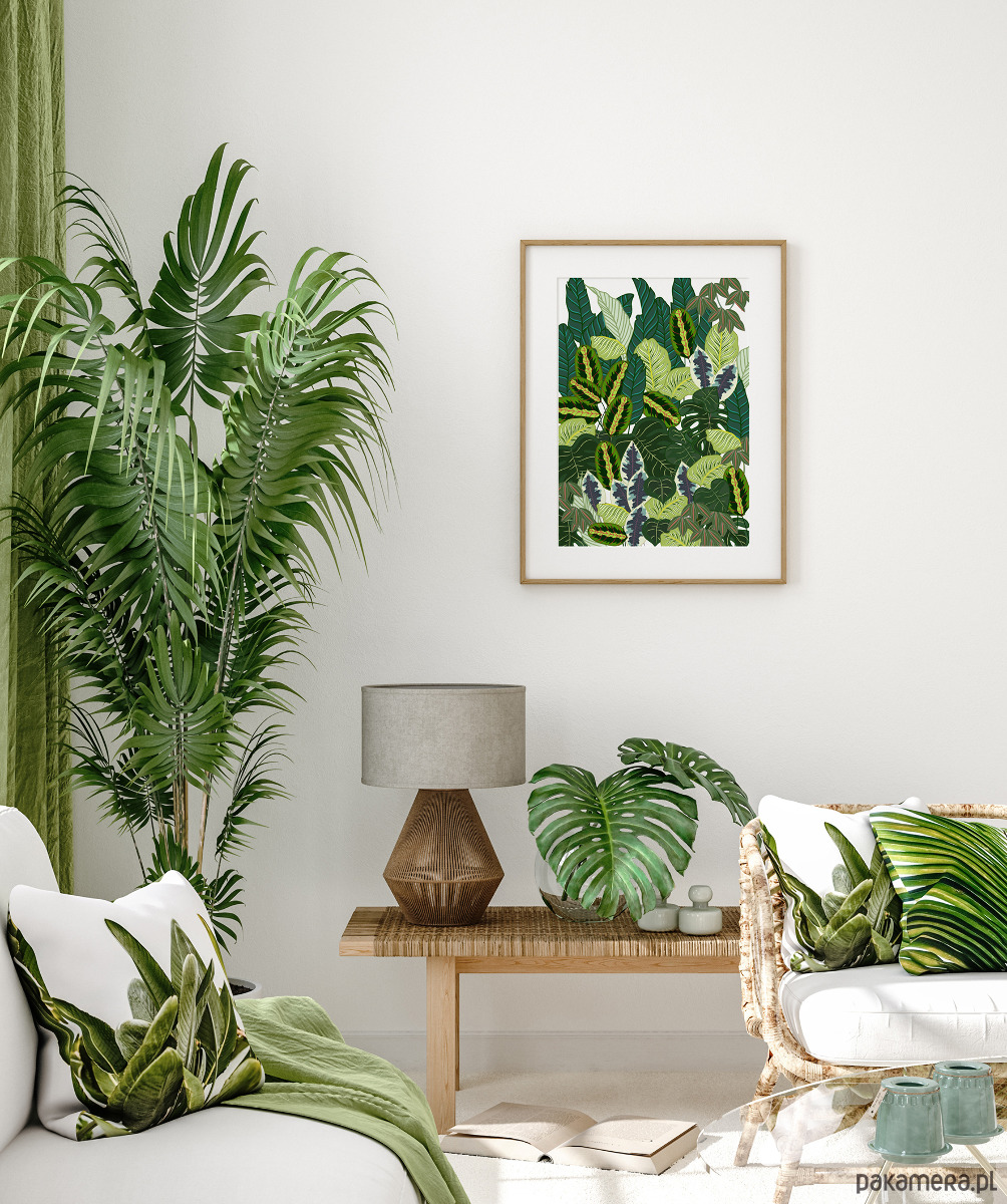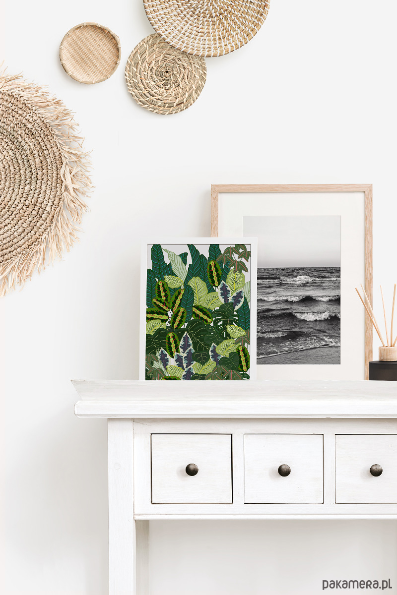 Piękna ilustracja na ścianę botaniczna. Egzotyczne liście, odcienie zieleni, idealny plakat do boho wnętrz i nie tylko. Na plakacie różne liście tj. Monstera, liście bananowca.