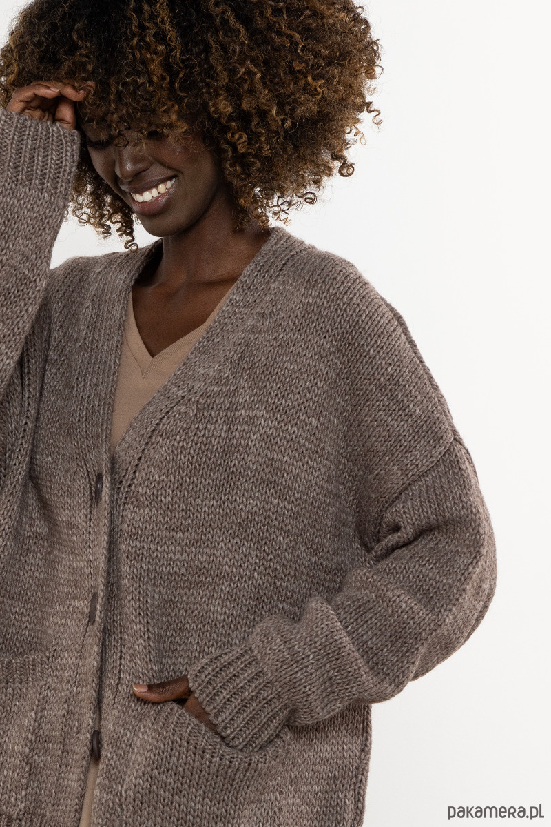 Propozycja dla kobiet ceniących prostotę, miękkość i funkcjonalność. Uszyty w Polsce z dbałością o detale. Basicowy krój z dekoltem V, zapięciem na guziki i kieszeniami płynnie przechodzi między casualem a smart casualem. Miękka dzianina z dodatkiem wełny otula i grzeje w sezonie jesień–zima.
