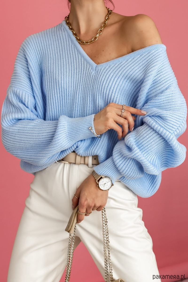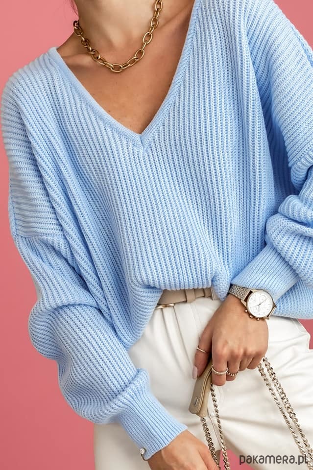 Najnowszy trend tego roku. Subtelny, sweter z domieszką wełny w pięknym jasno niebieskim kolorze z najnowszej kolekcji NEAHT organic. Ponadczasowy trend. Sweter wyróżnia się miękkością i wyjątkowo kobiecym stylem. Wygodny z klasycznym dekoltem w kształcie V. Dekolt w subtelny sposób eksponuje szyję.
