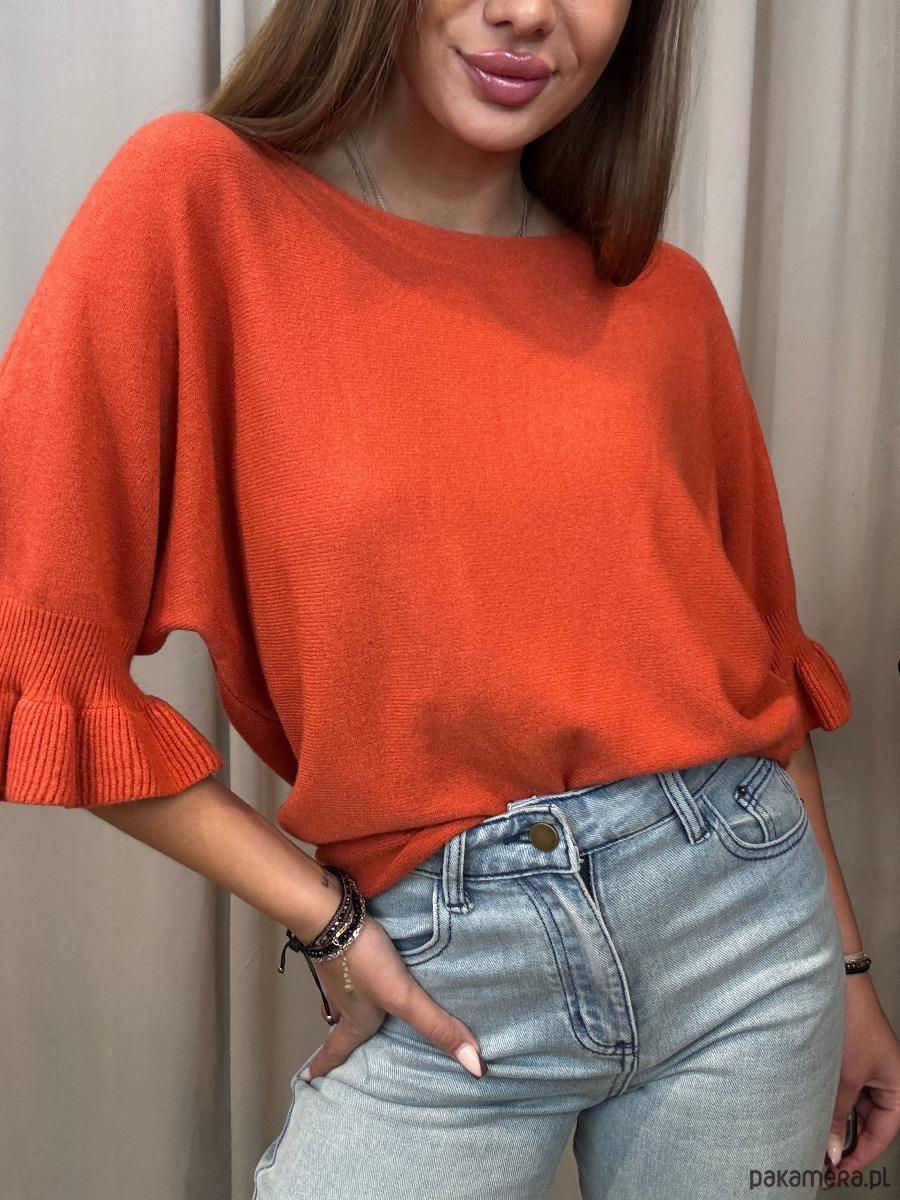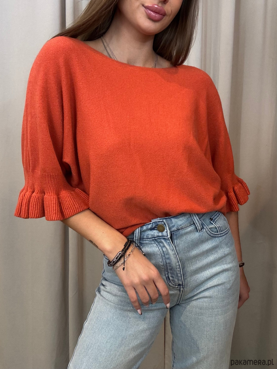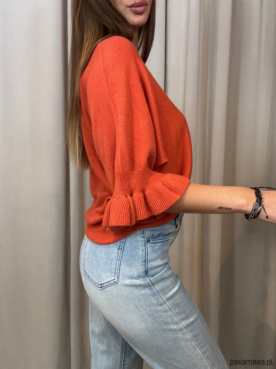 Sweter damski, z falbankami na wykończeniu rękawów.