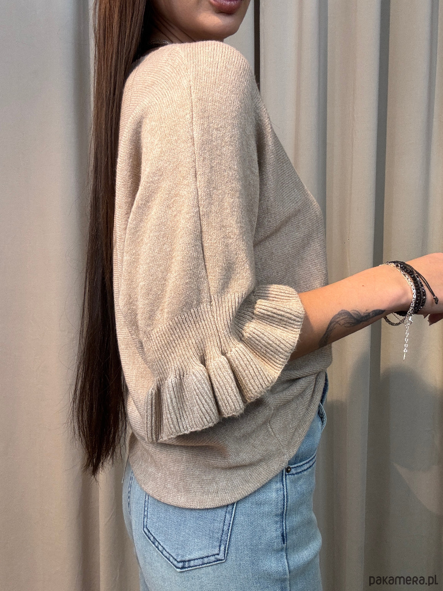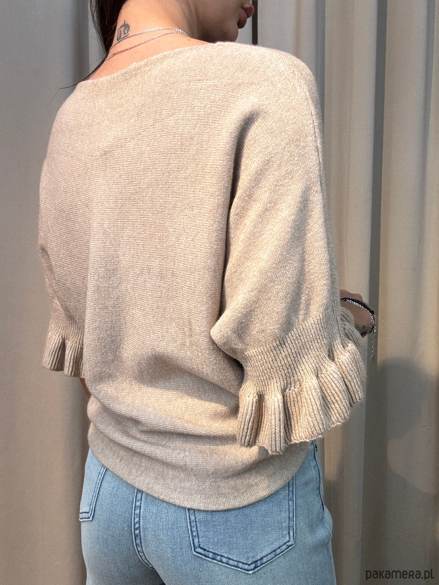 Sweter damski, z falbankami na wykończeniu rękawów.