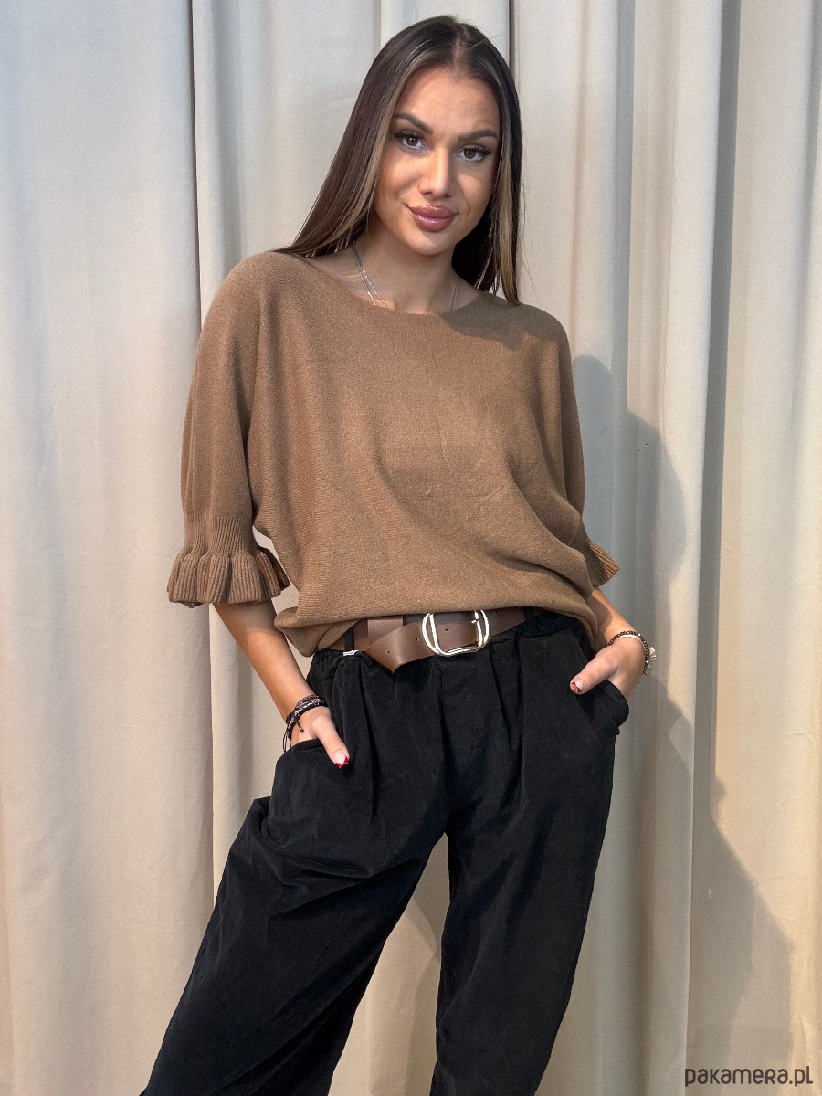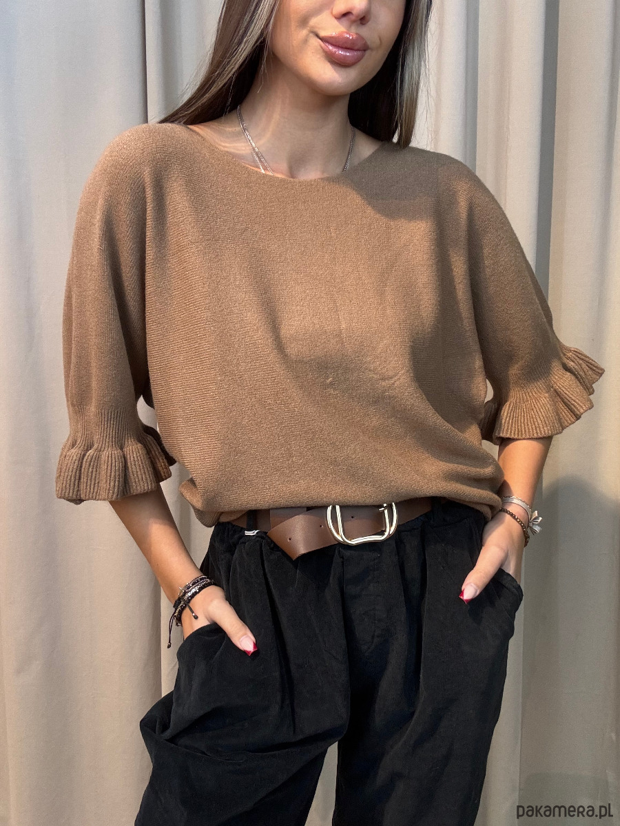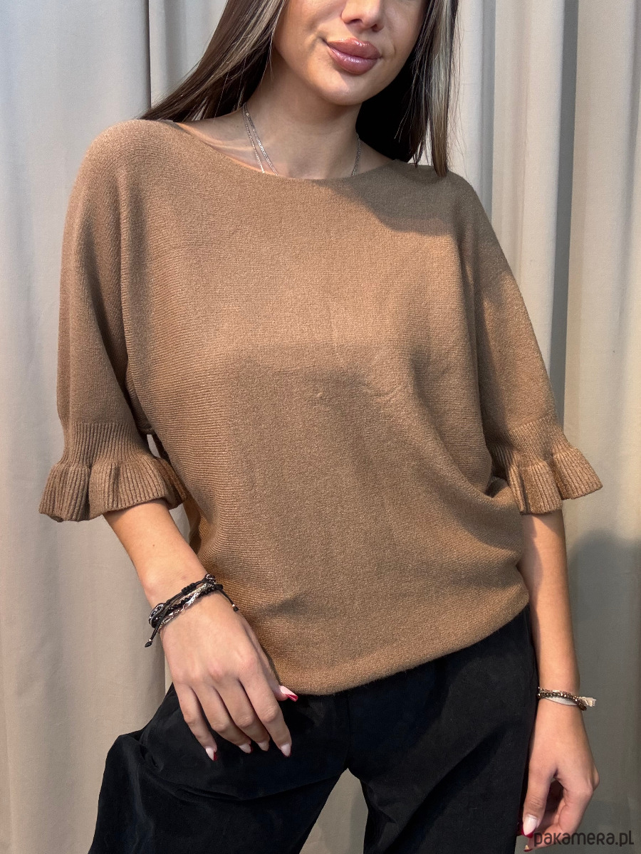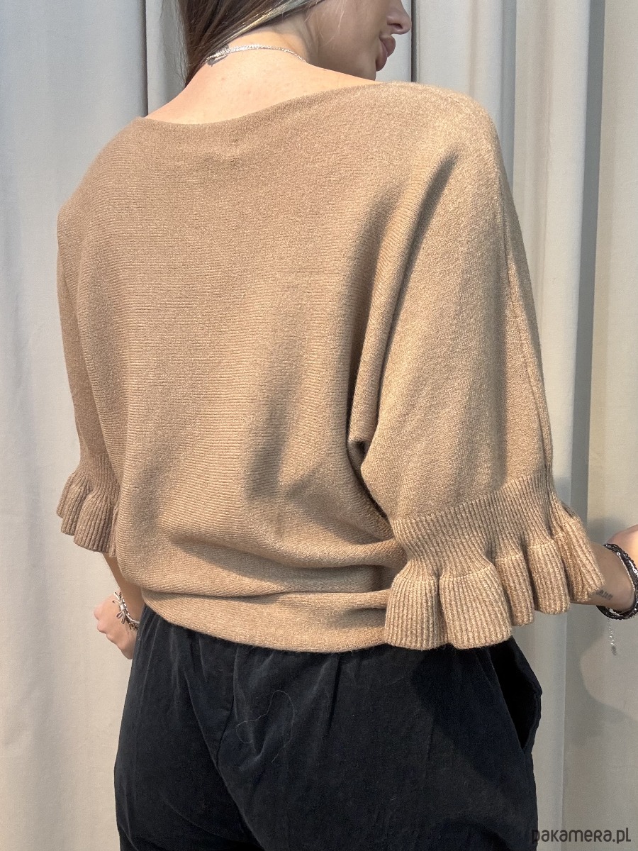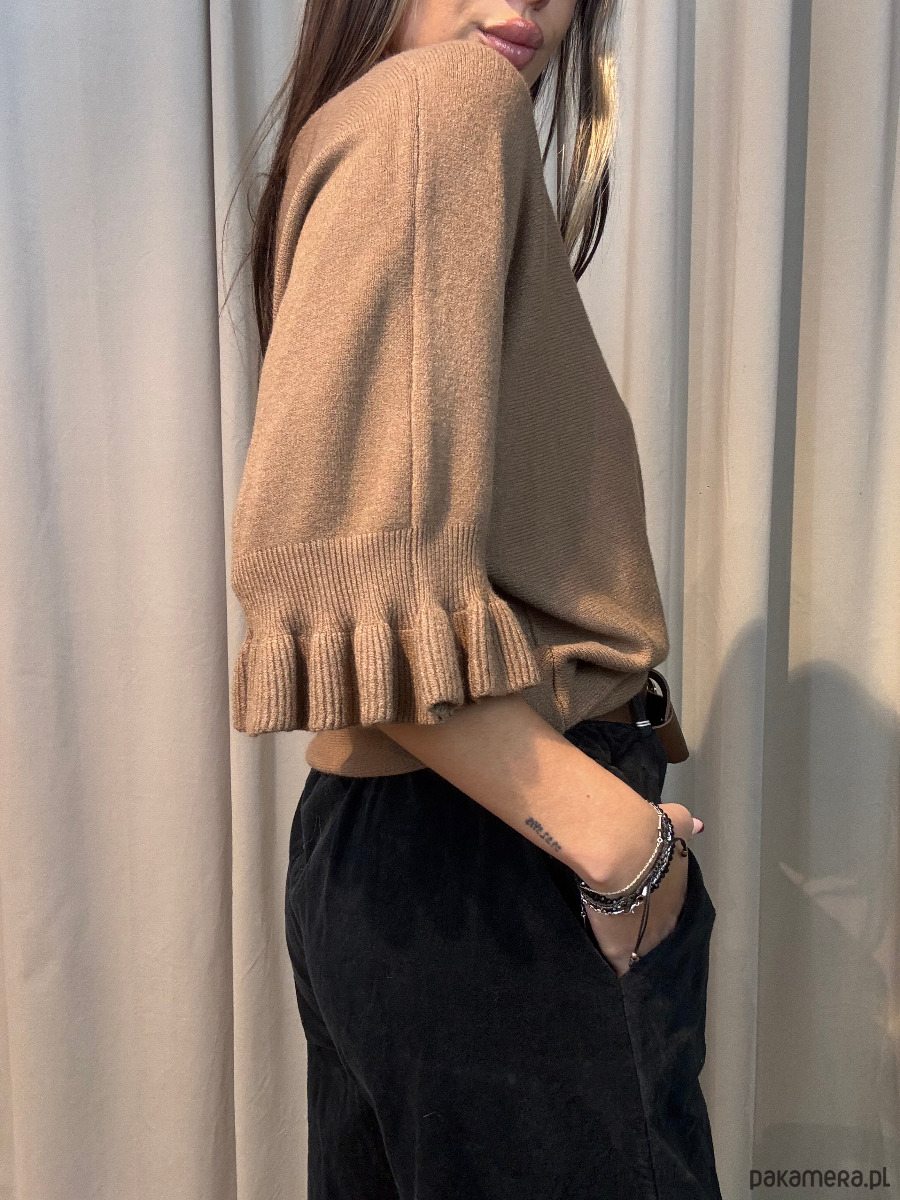 Sweter damski, z falbankami na wykończeniu rękawów.