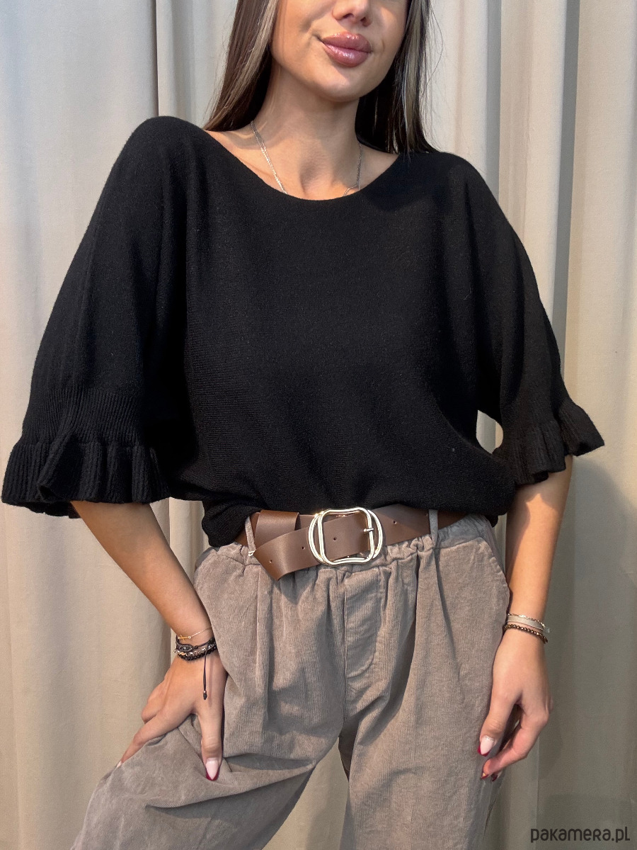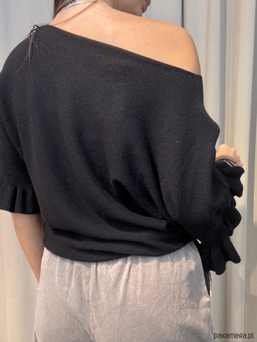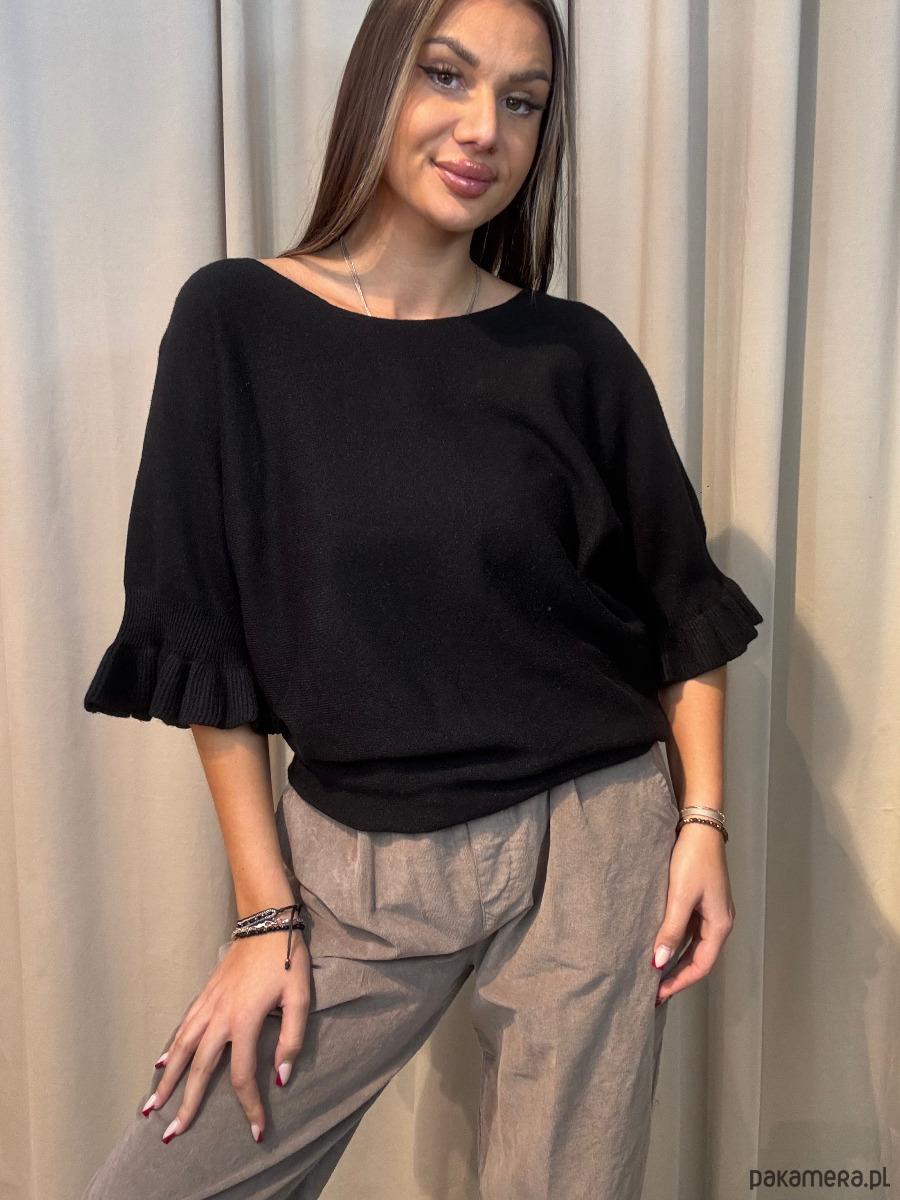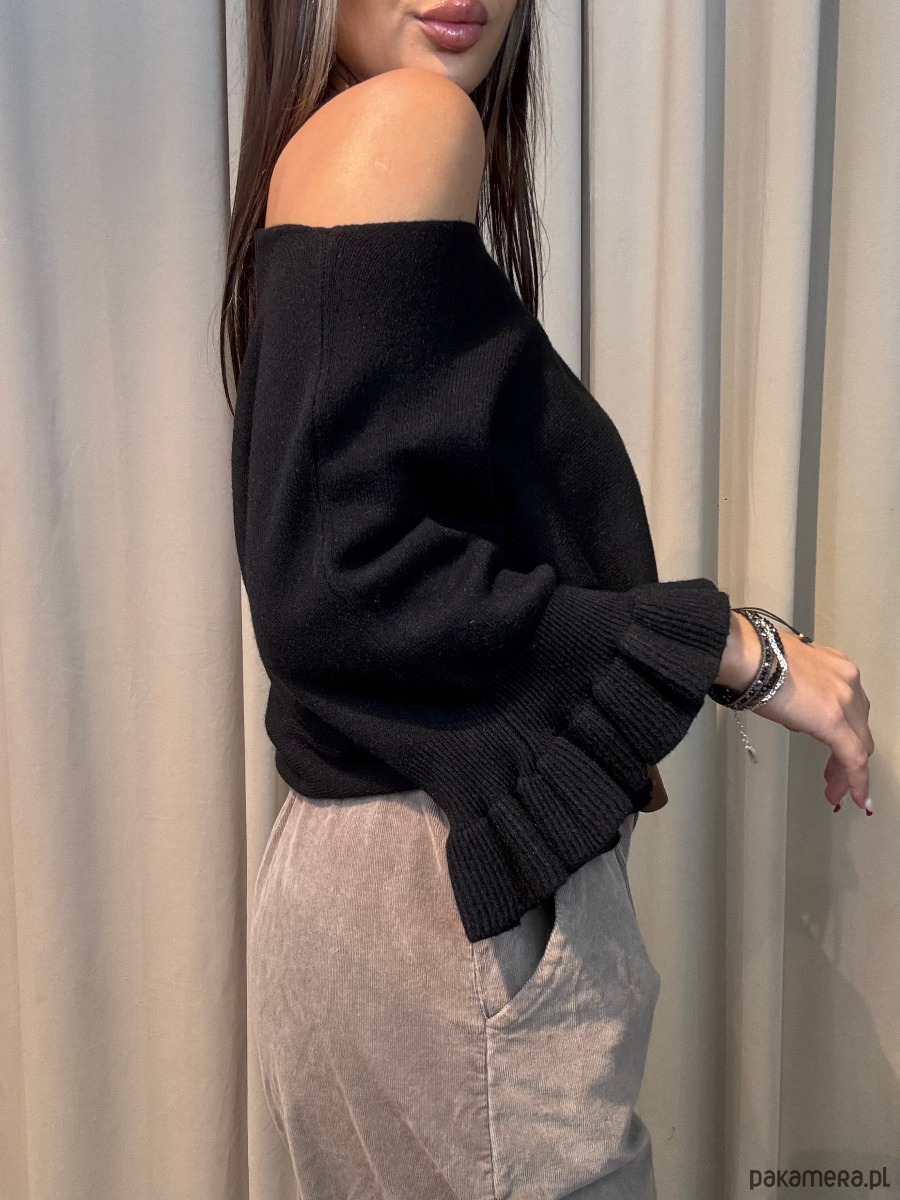 Sweter damski, z falbankami na wykończeniu rękawów.