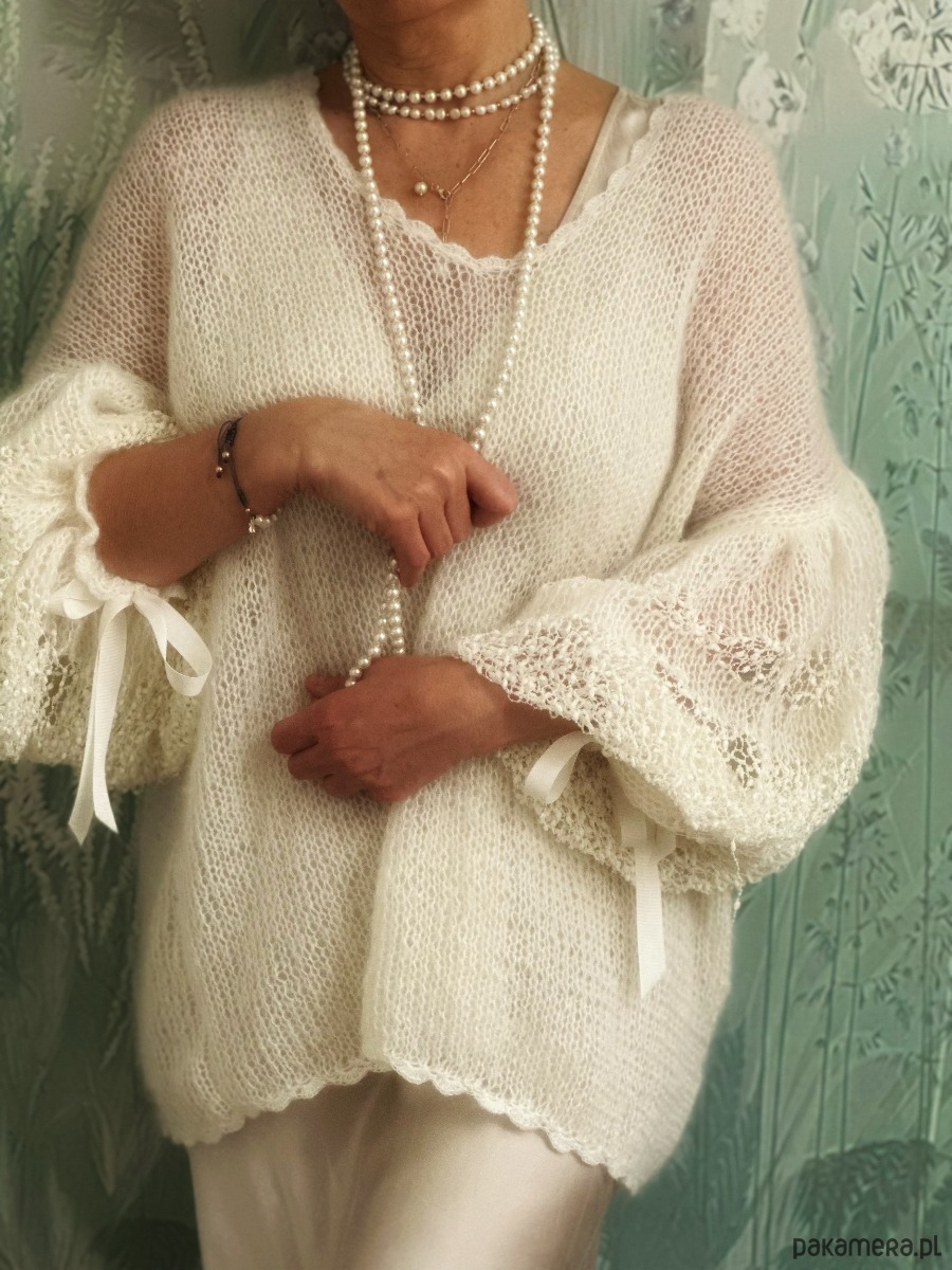 To, co go wyróżnia, to dbałość o detale. Szerokie, zamaszyste rękawy zapewniają swobodę, a dzięki eleganckim rypsowym wstążkom możesz regulować szerokość mankietów, zmieniając kształt rękawa z dzwonowatego na bufiasty. Całość wykończona jest misterną, szydełkową koronką, która dodaje projektowi romantycznego, vintage’owego charakteru.