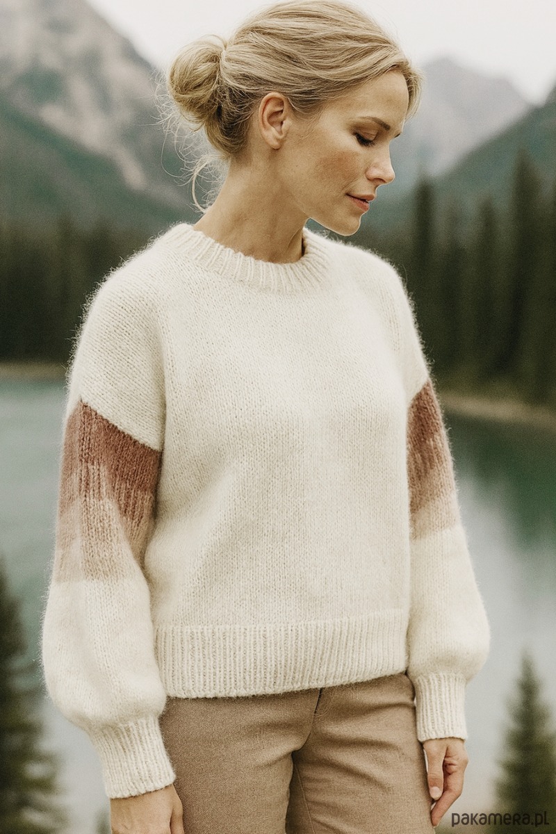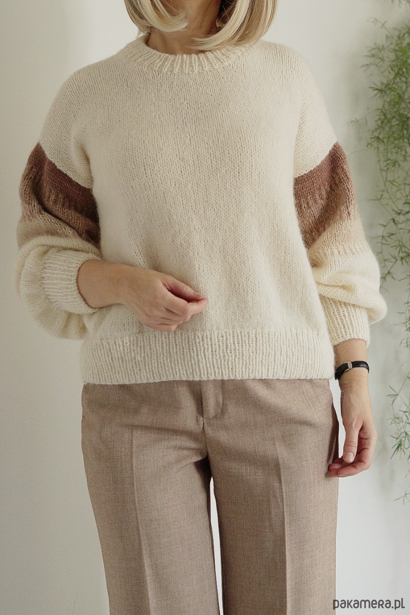 Kolor ecru w połączeniu z trzema odcieniami beżu w postaci aplikacji na rękawach.