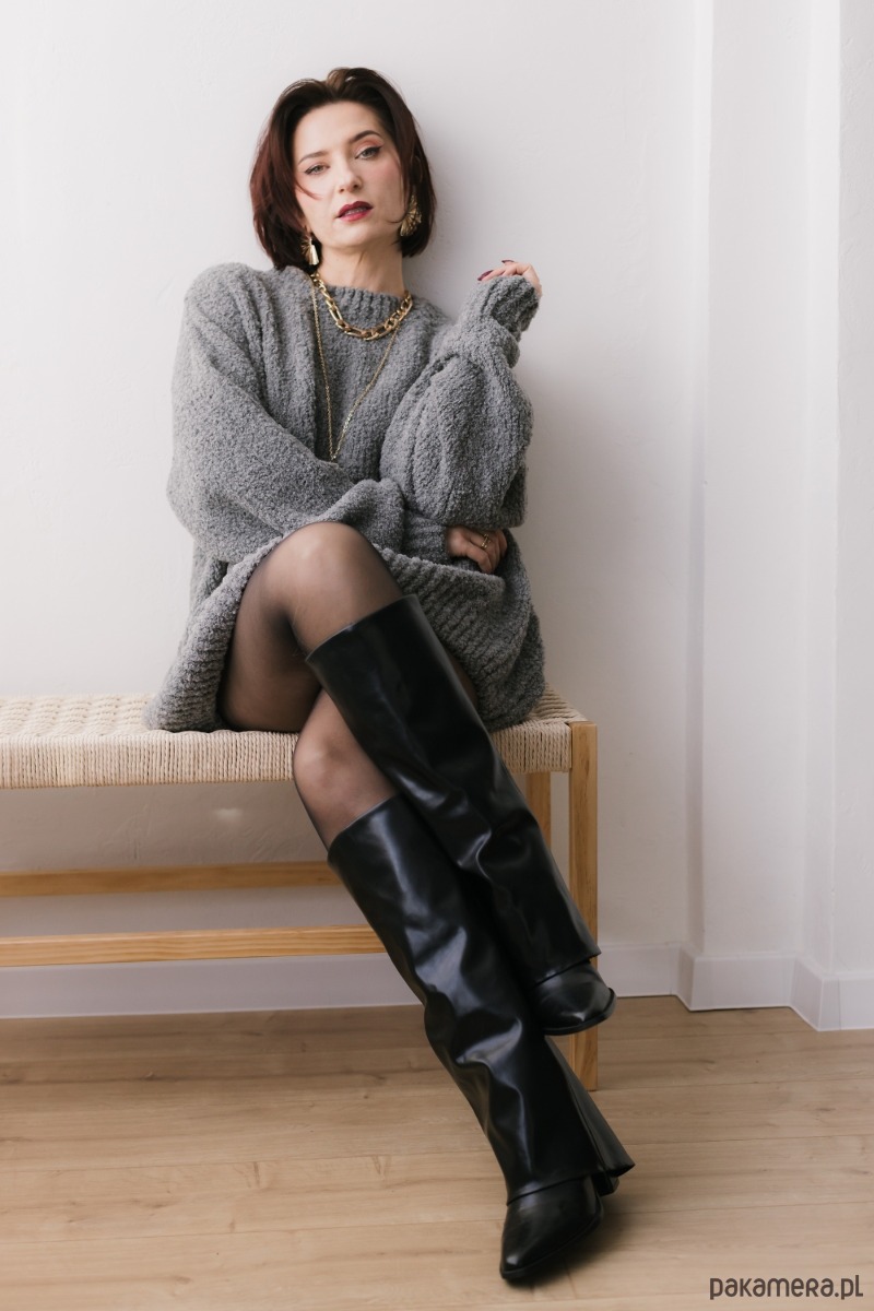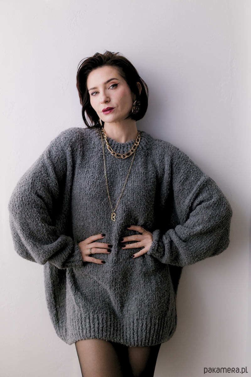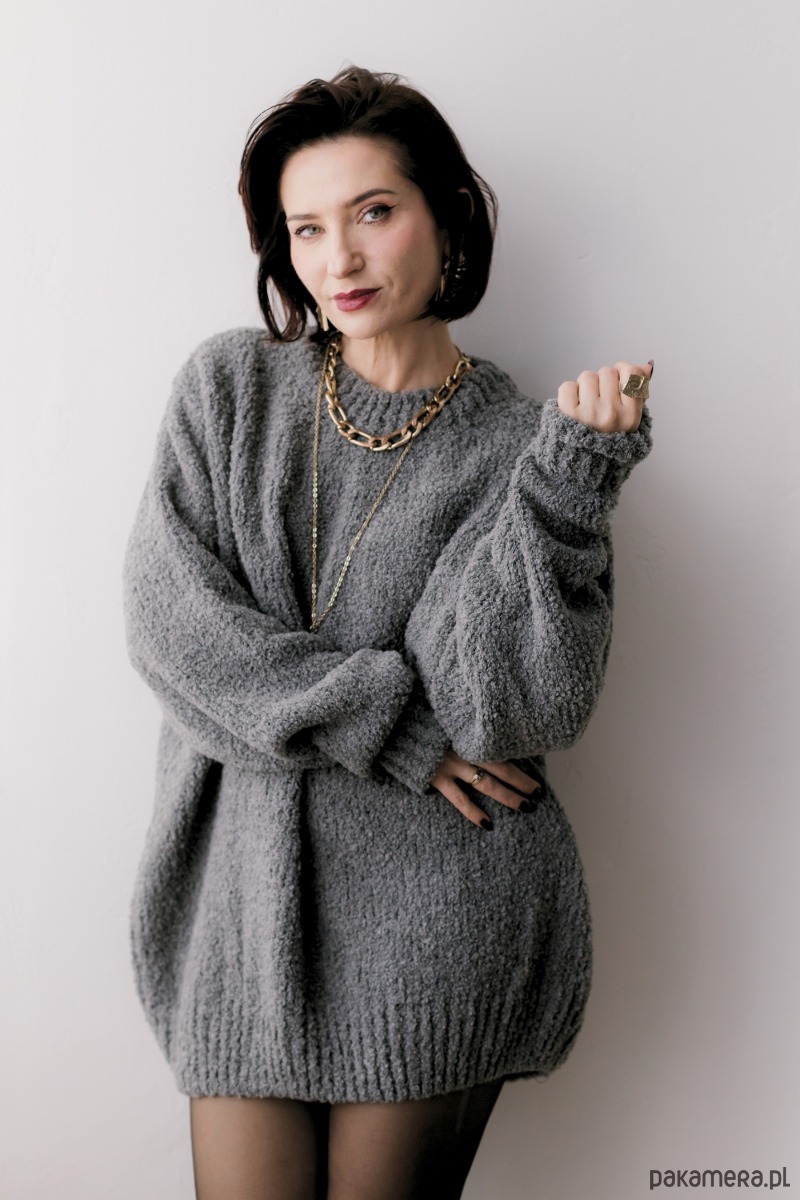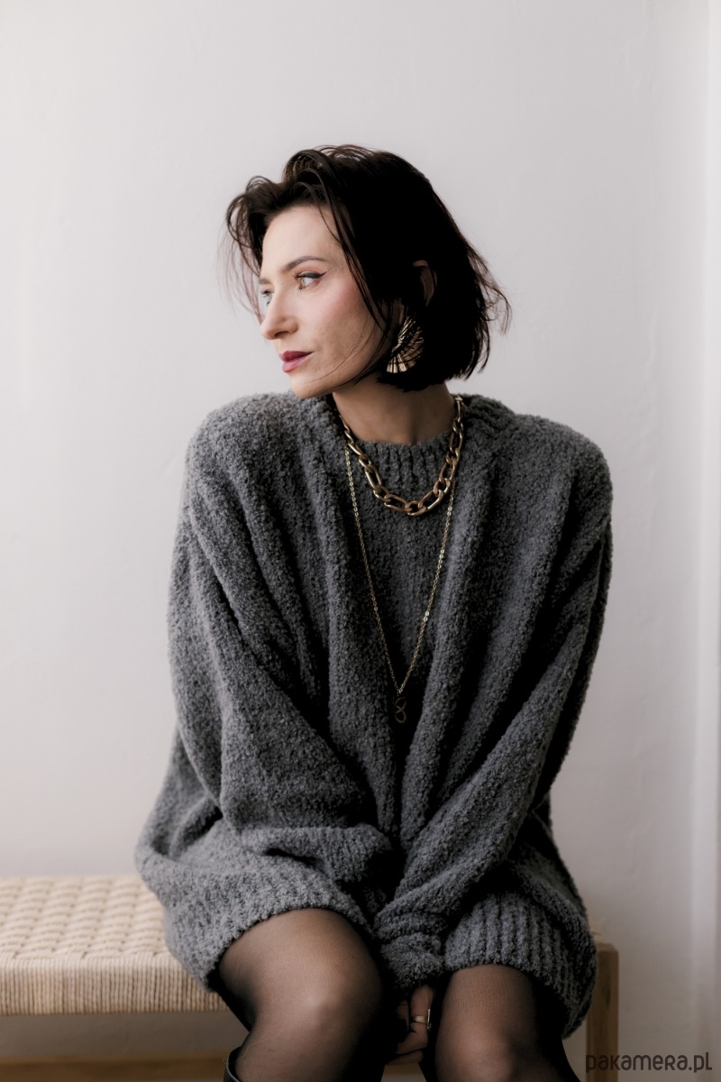 Miękki, duży i plastyczny — bouclé. Możesz nosić go jako miniówkę do kozaków albo na jeansy w swobodnej, otulającej wersji. Ciepły, zmysłowy, o efektownej fakturze, która pięknie pracuje z sylwetką.