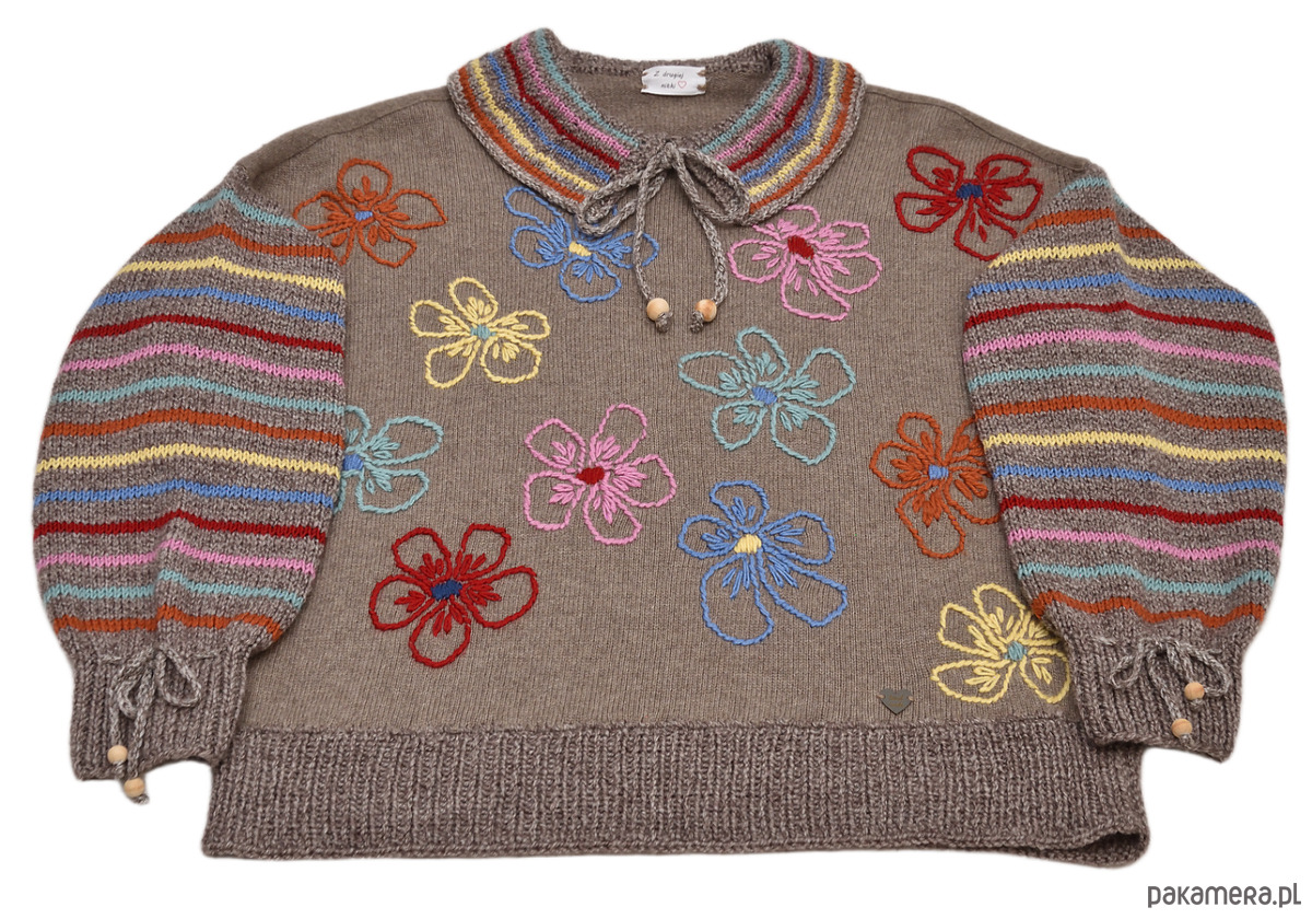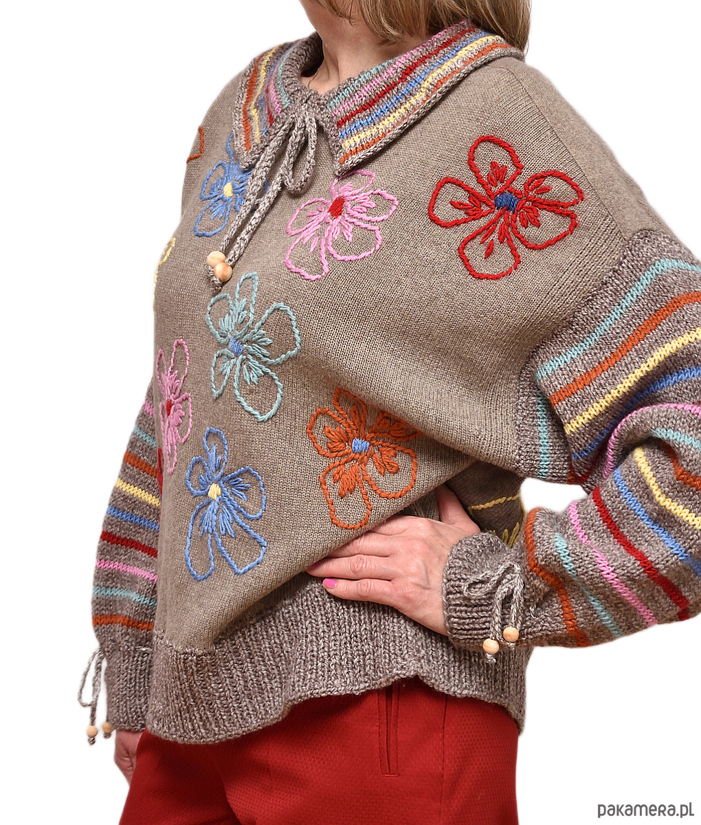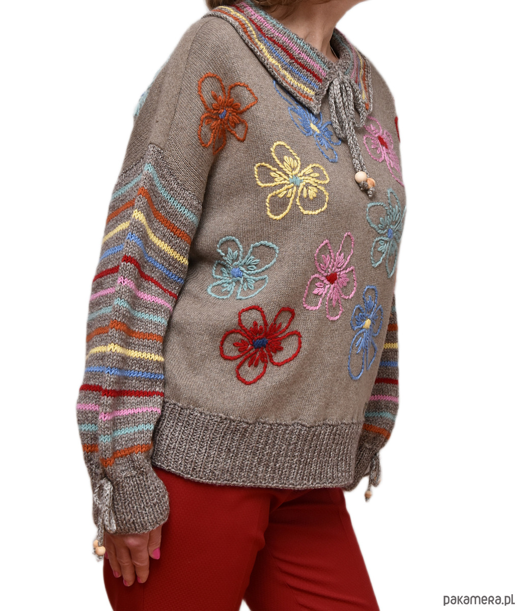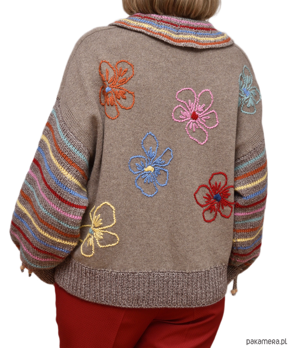 Sweter w kolorze jasnobrązowym z haftowanymi ręcznie kwiatami oraz kołnierzykiem i rękawami w kolorowe prążki.
