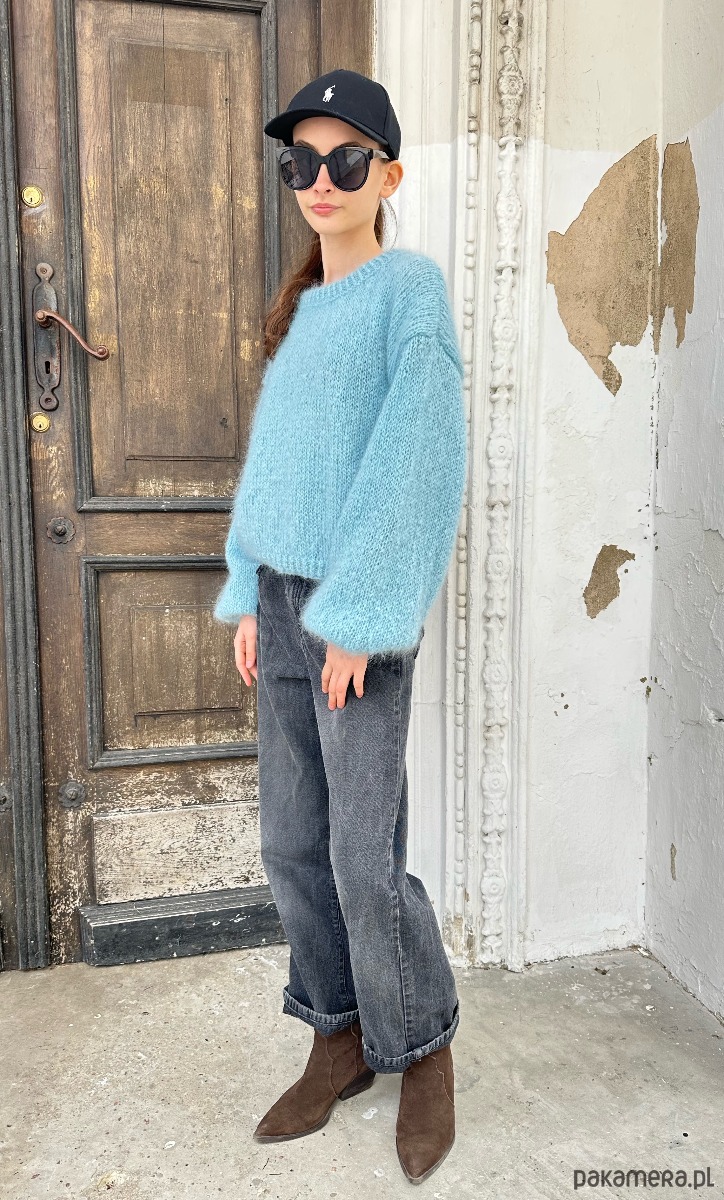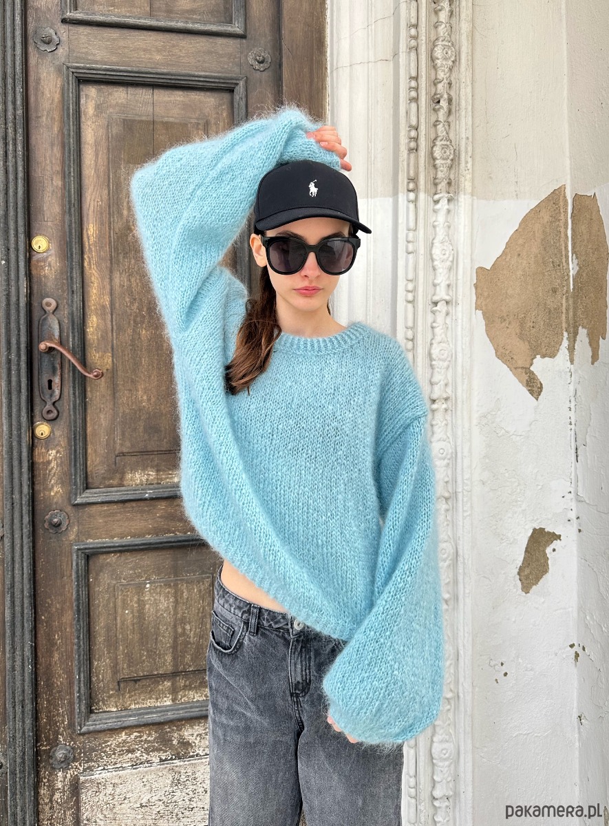 Sweter Classic Mohair to puszysty sweter zrobiony na drutach z całkowicie naturalnej włóczki , która w składzie posiada 73% moheru i 27% owczej wełny wełny. Urzeka niezwykłą lekkością oraz długim włoskiem, który jest bardzo efektowny, ale może lekko podgryzać bardziej wrażliwe osoby. Sweter ma szerokie rękawy, ale na tyle by zmieściły się pod standardowy płaszcz lub kurtkę. Jego cudowny błękitny odcień w połączeniu z puszystym, długim włoskiem zachwyca.