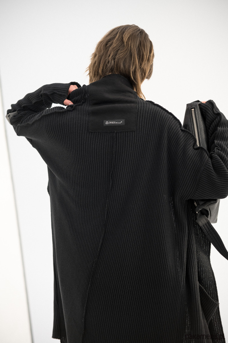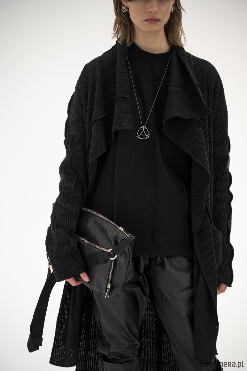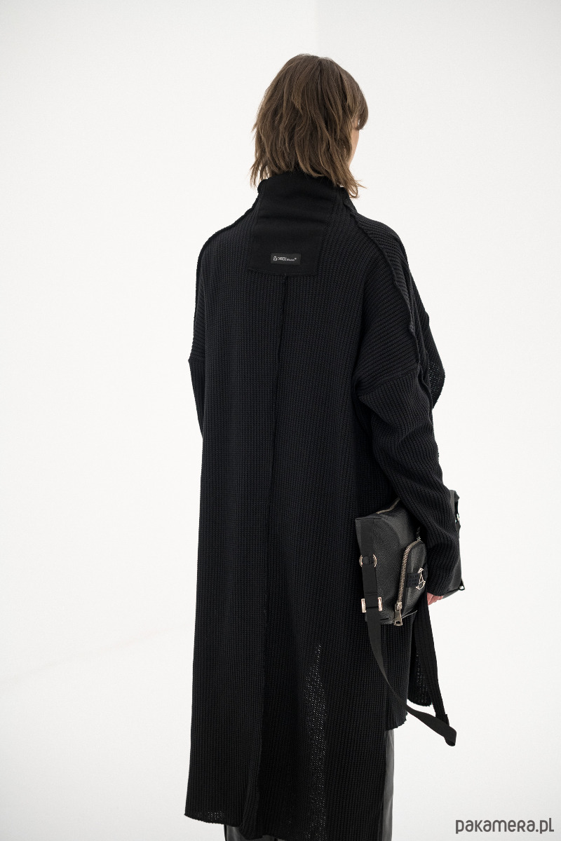 Oversize'owy fason, geometryczna forma i tekstura dzianiny, dodatkowo podkreślają mocną formę swetra, dodając oryginalności i niepowtarzalności