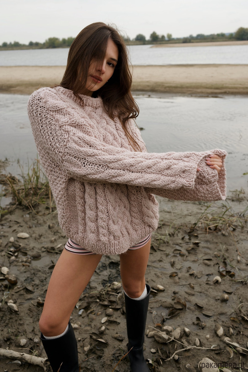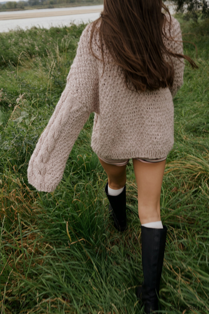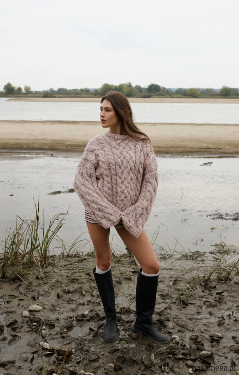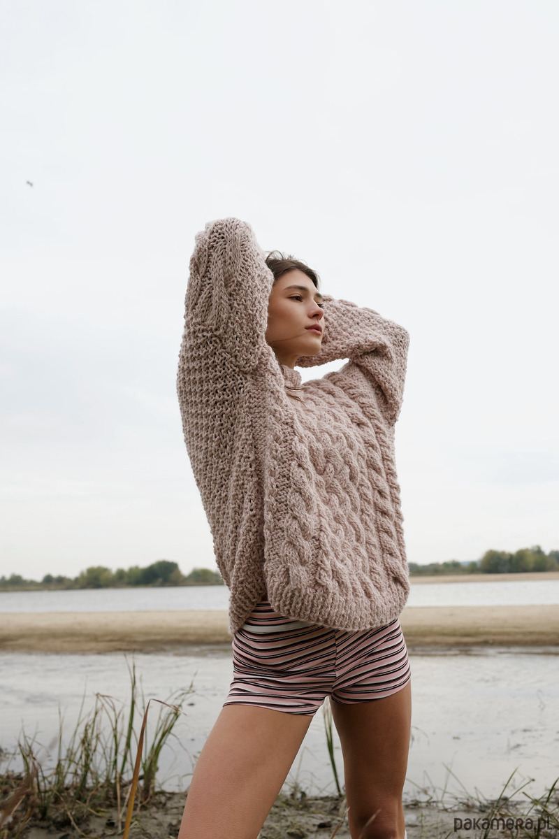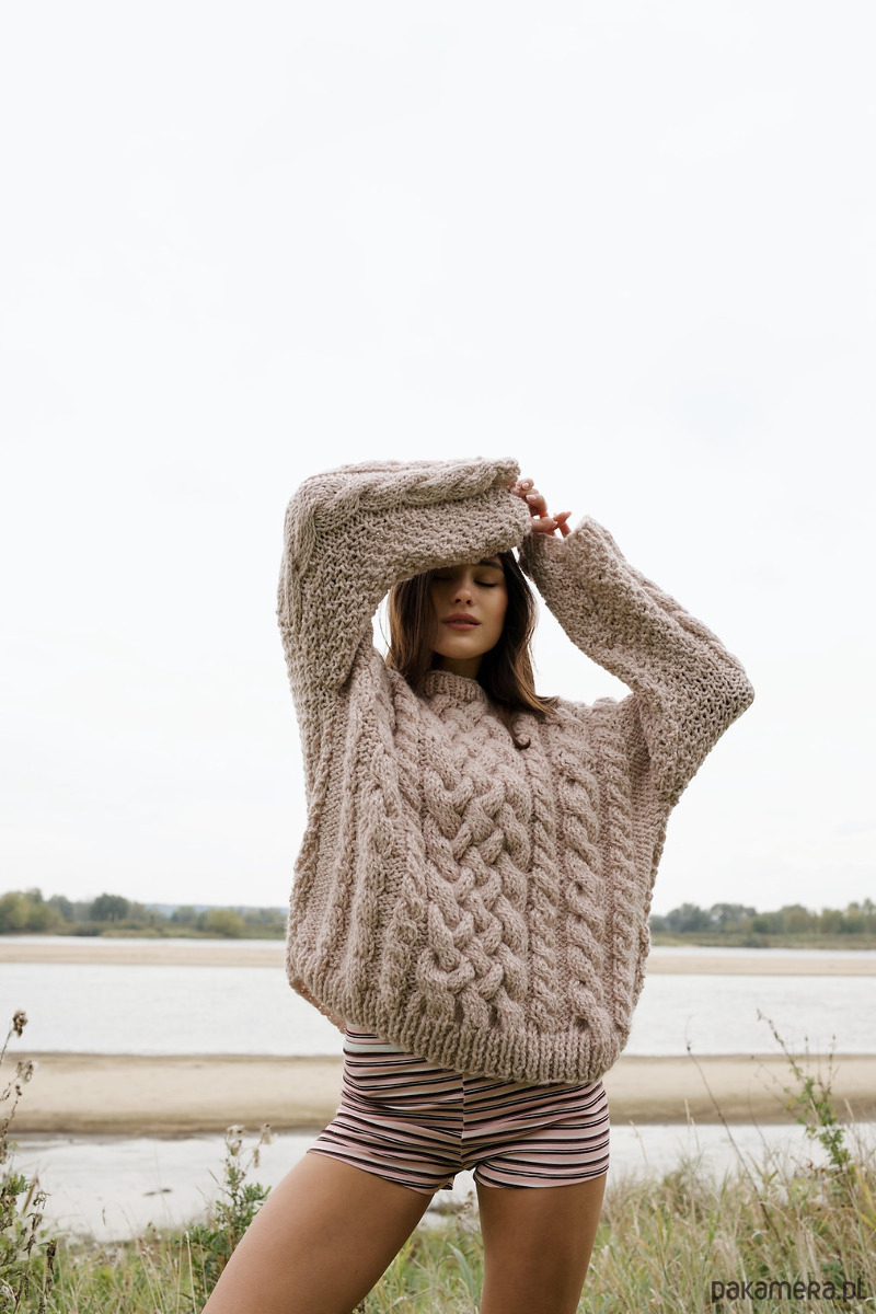 Ten gruby i mięsisty sweter Finn miło otuli Twoje ciało. Piękny warkoczowy splot sprawia, że sweter ma niepowtarzalny wygląd i jest unikatowy. Przędza alpaki z której został wydziergany jest niezwykle miękka i delikatna dla skóry. Duży sweter który zarzucisz na siebie aby się miło ogrzać. Ubierz go idąc na yoge czy pilates do legginsów, noś do jeansów, maxi spódnic, bermudów czy szortów np. z butami z cholewką do kolan. Będziesz wyglądać w nim stylowo i niepowtarzalnie pięknie!