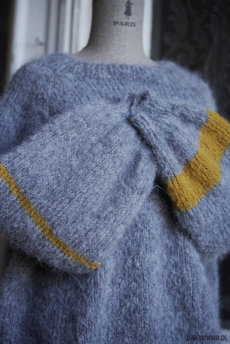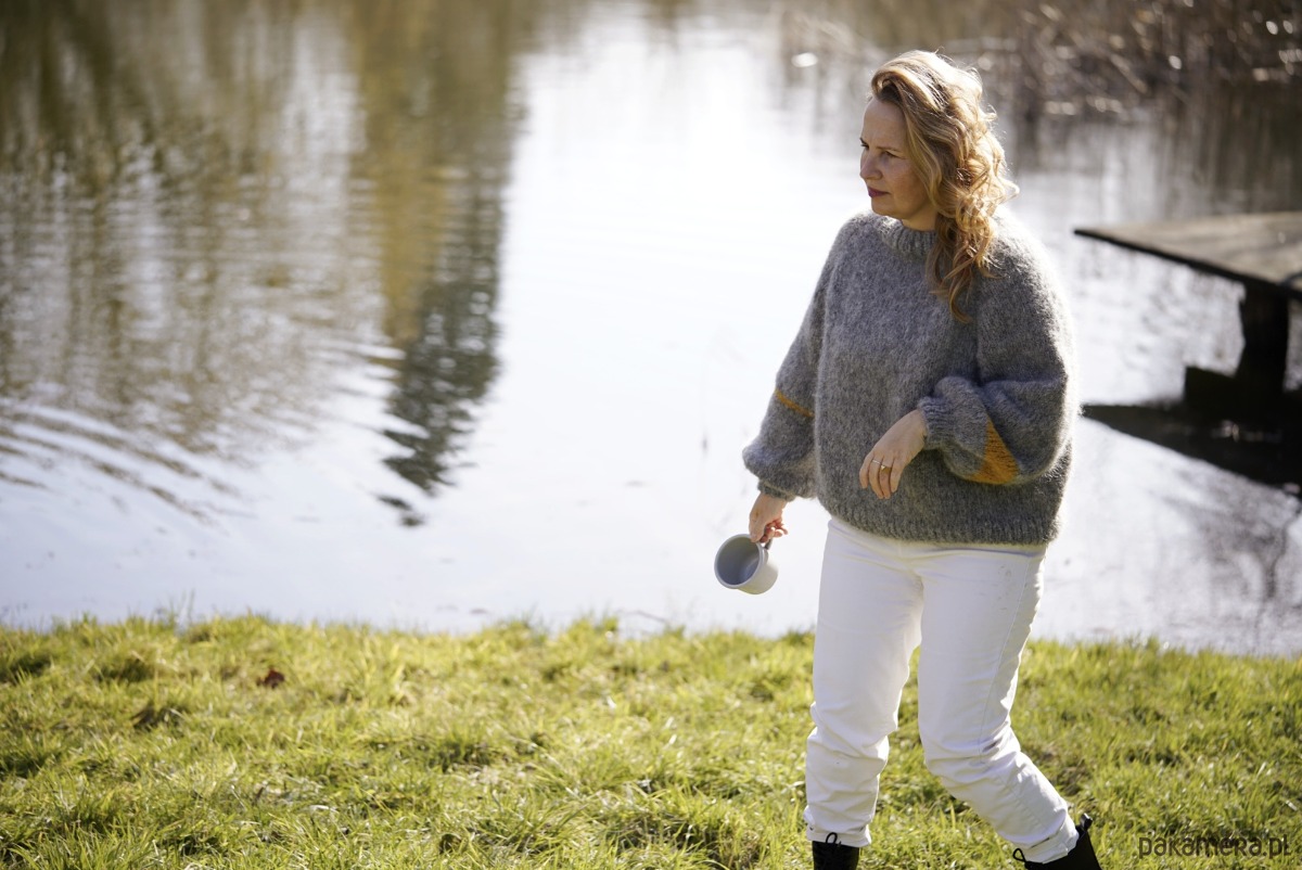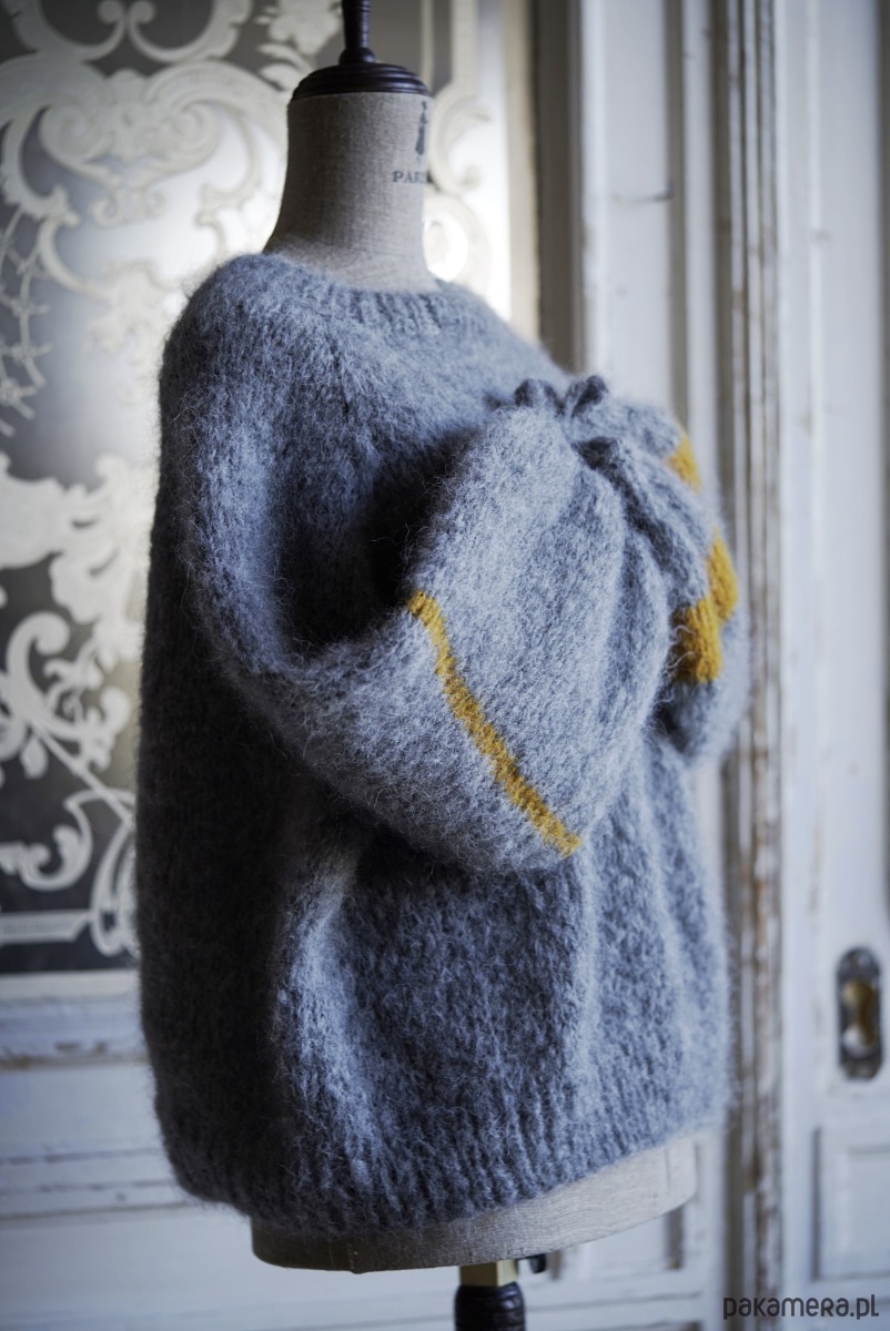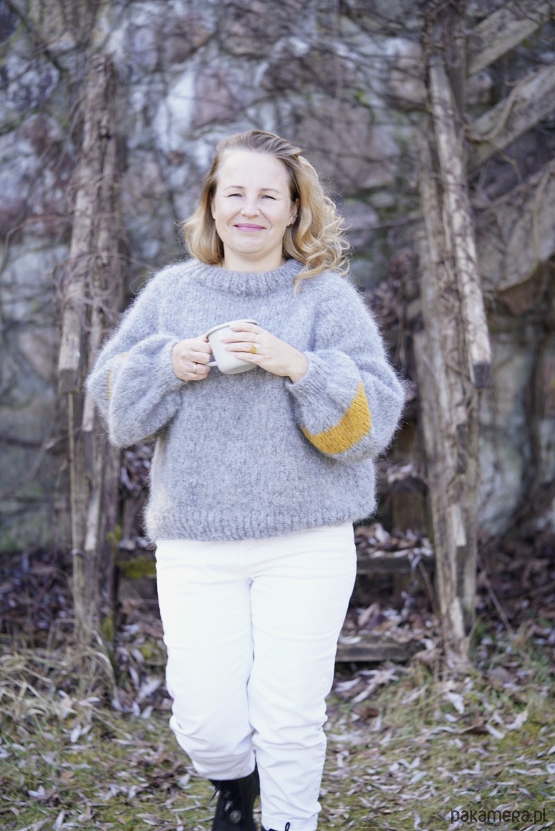 Niesamowicie lekki choć bardzo ciepły i włochaty , przy tym wytrzymały sweter w kolorze szarym z minimalistycznymi wstawkami w rękawach w odcieniu curry.