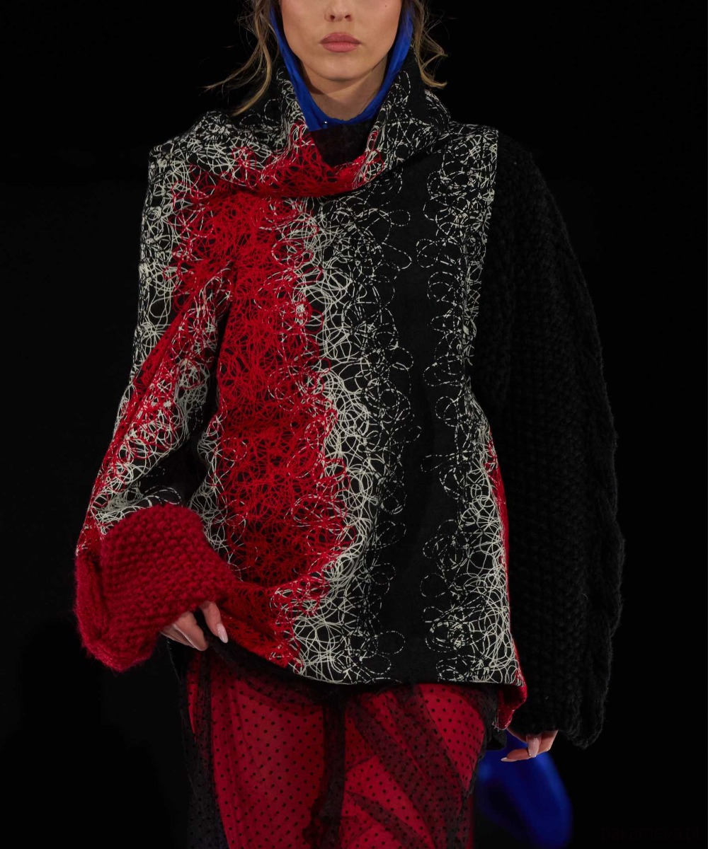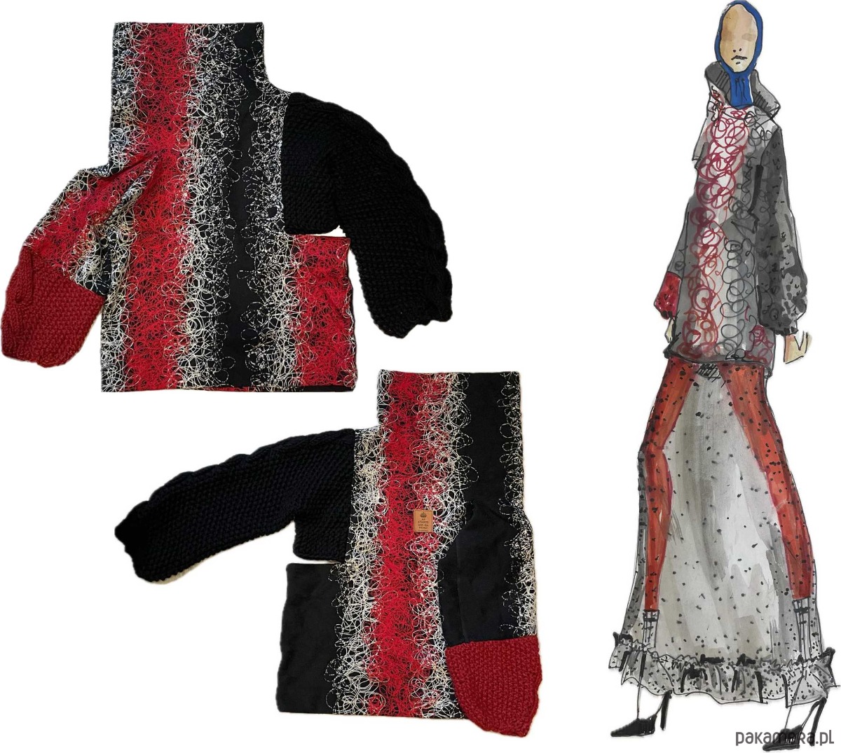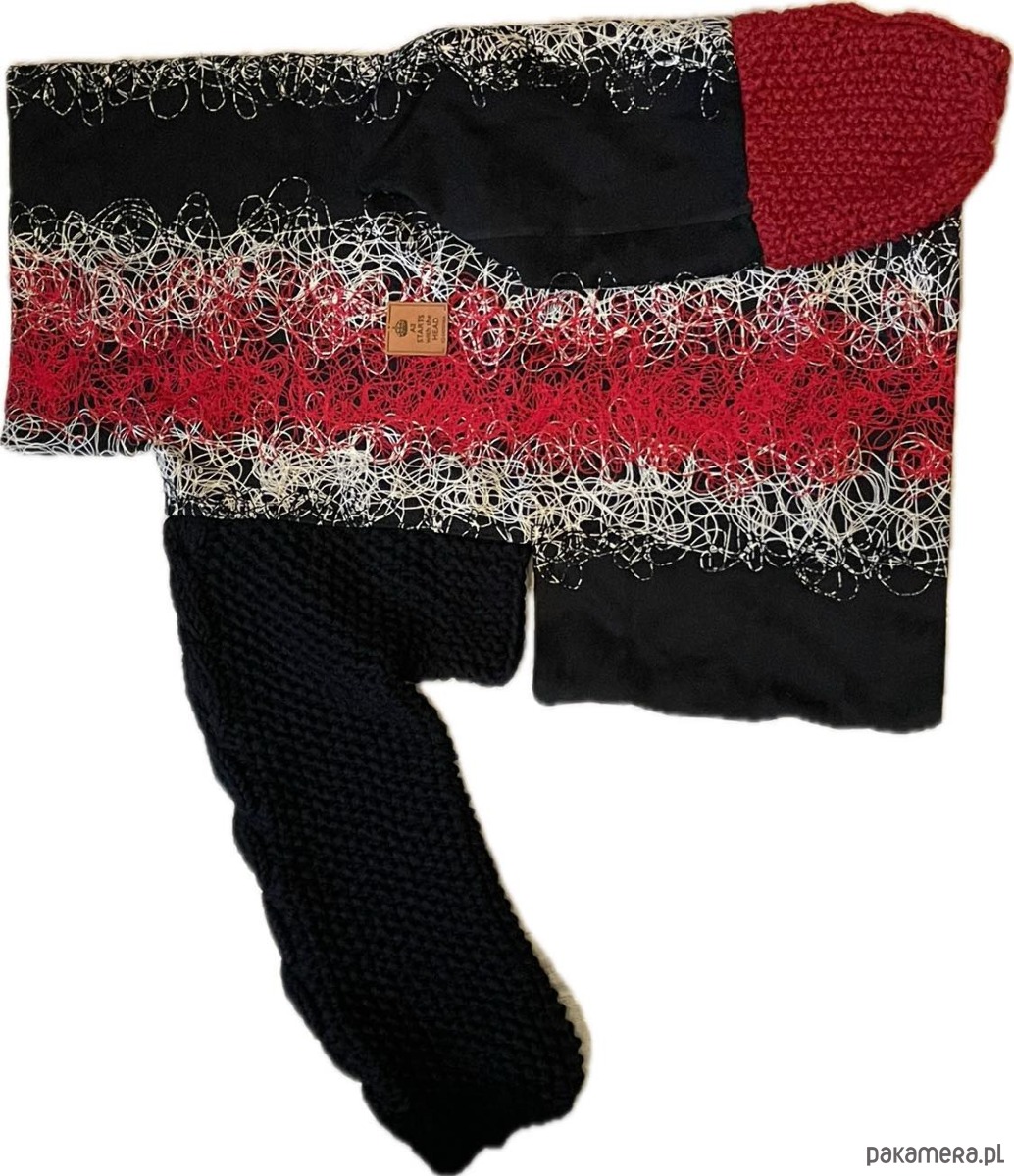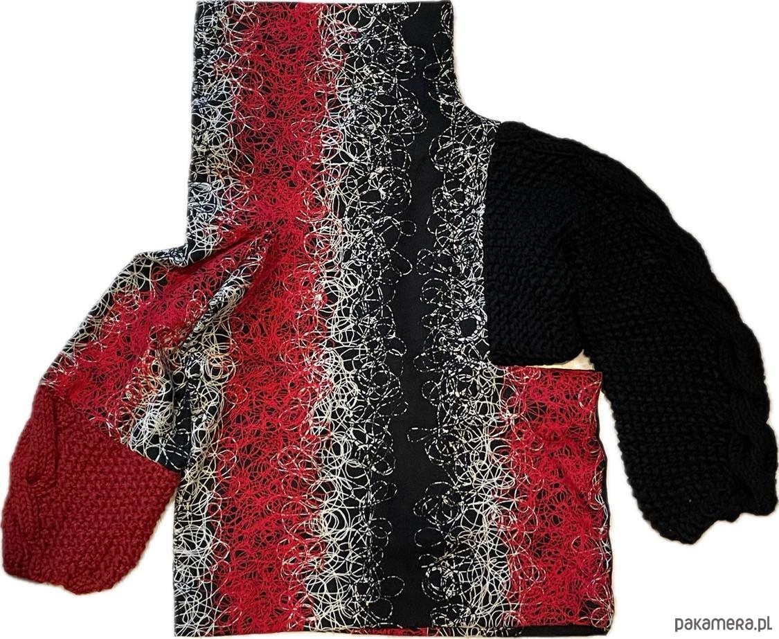 Ten unikalny sweter oversize z golfem to połączenie klasycznego stylu z artystycznym kunsztem. Wykonany z wysokiej jakości wełnianej tkaniny haftowanej czarną, białą i czerwoną nitką, przyciąga wzrok i podkreśla indywidualność każdej stylizacji. Rękawy dziergane ręcznie dodają mu niepowtarzalnego charakteru.