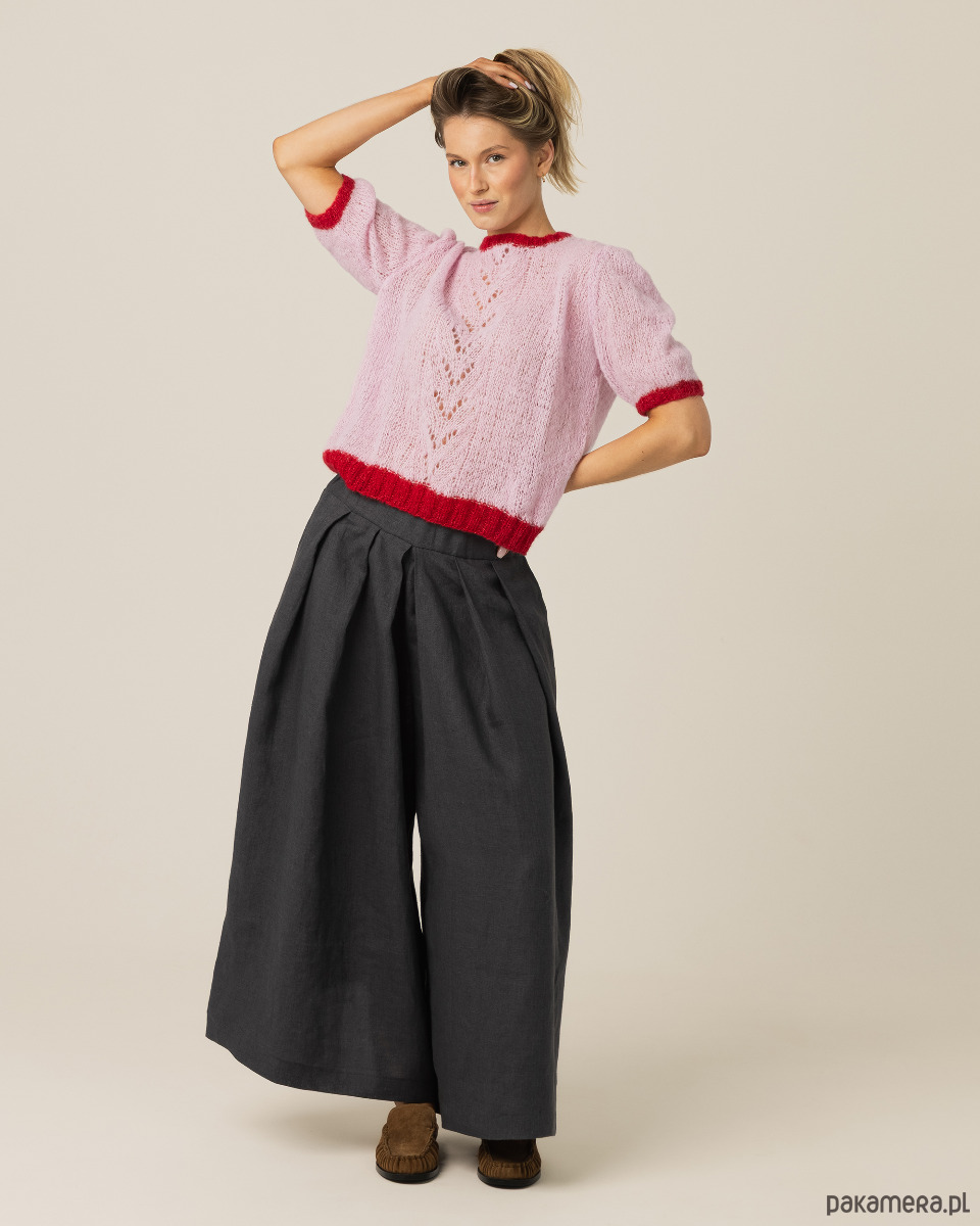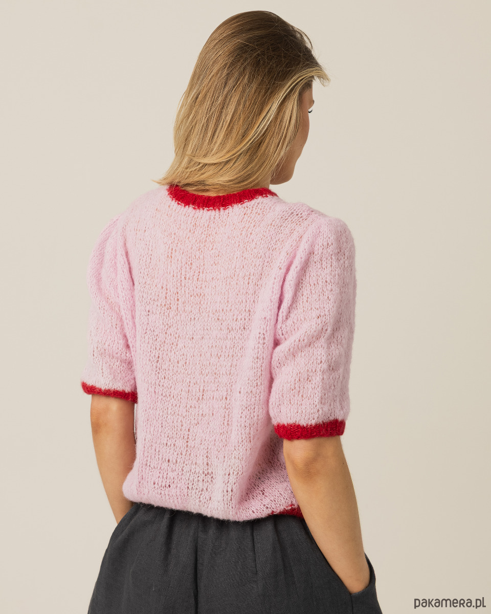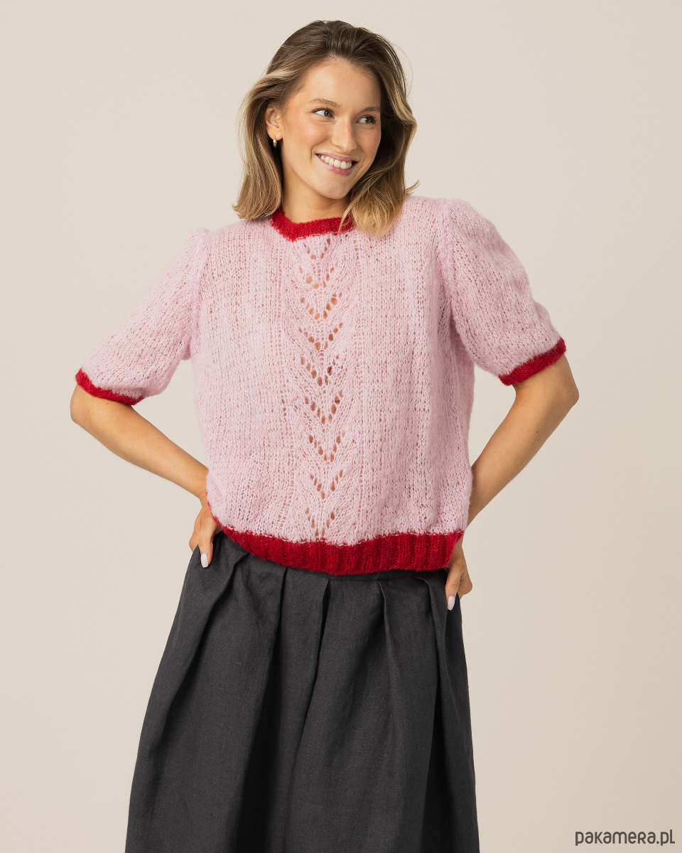 Luźny splot czyni go niezwykle lekkim i przewiewnym, dzięki czemu doskonale sprawdza się w cieplejsze dni lub jako delikatne uzupełnienie stylizacji. Harmonijne połączenie kolorystyczne oraz romantyczne ażury z przodu wprowadzają do projektu lekkość, figlarność i kobiecy, subtelny urok.