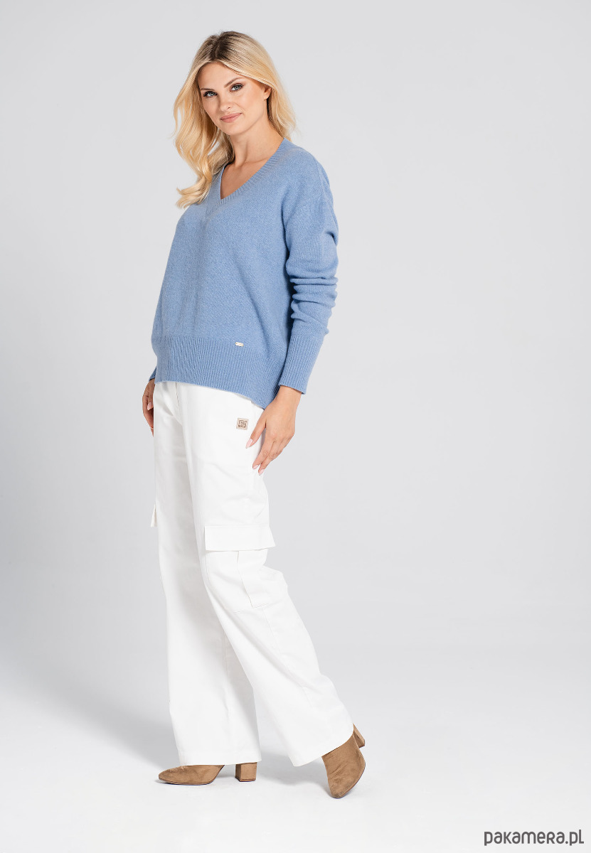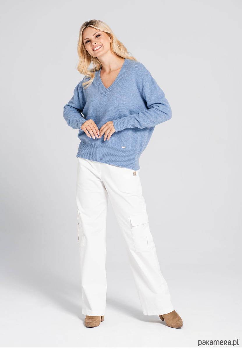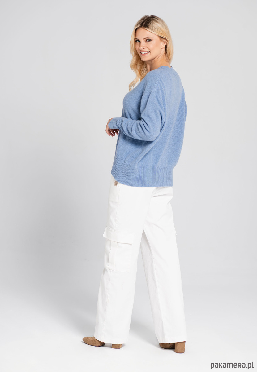 Klasyczny sweter z lekkiej wełnianej przędzy z kaszmirem. Luźna, pudełkowa forma z pięknym dekoltem w serek, wykończona klasycznym ściągaczem. Ponadczasowy, uniwersalny i klasyczny sweter, który zapewni Ci miękki komfort. Jesienny sweter, zimowy sweter o delikatnym splocie, miękki, swobodny i komfortowy.