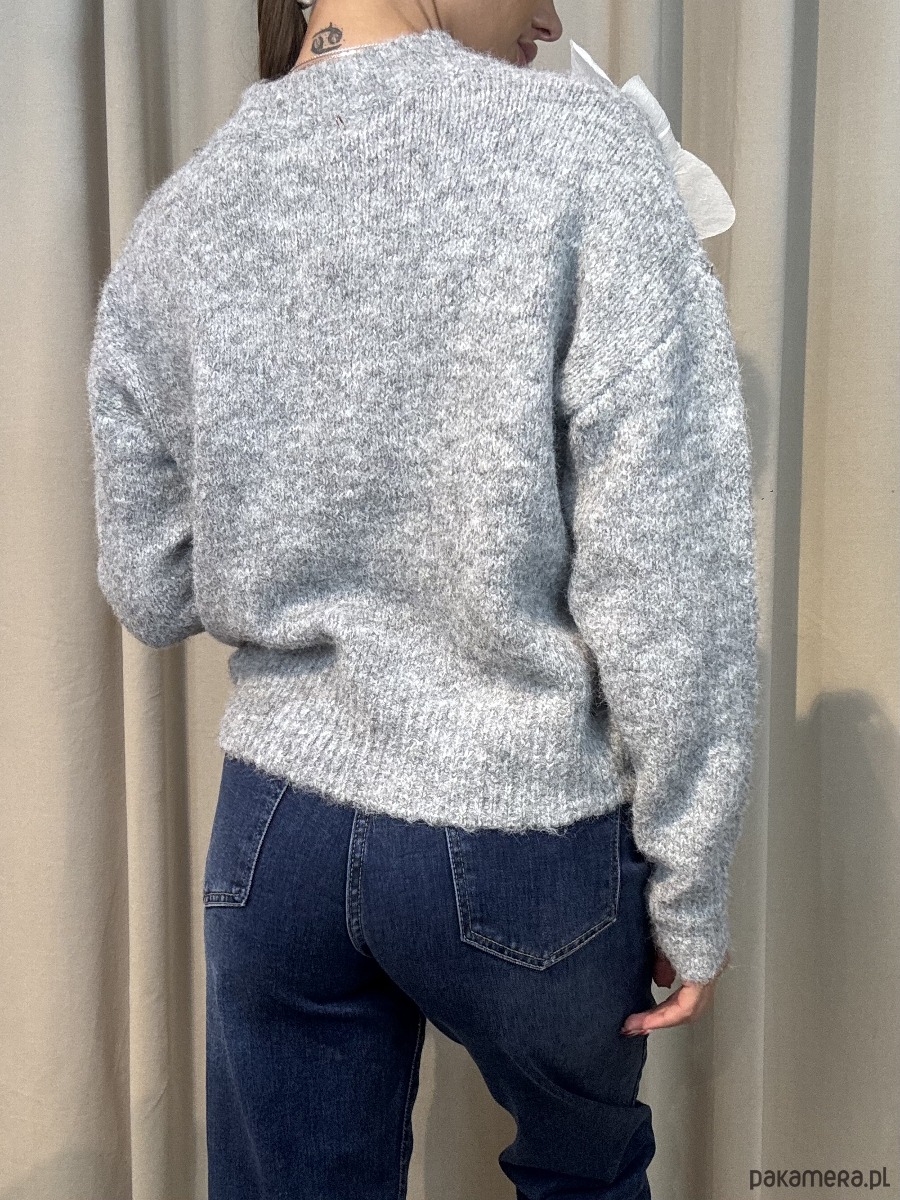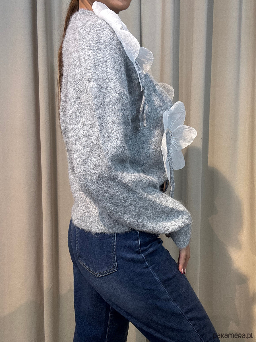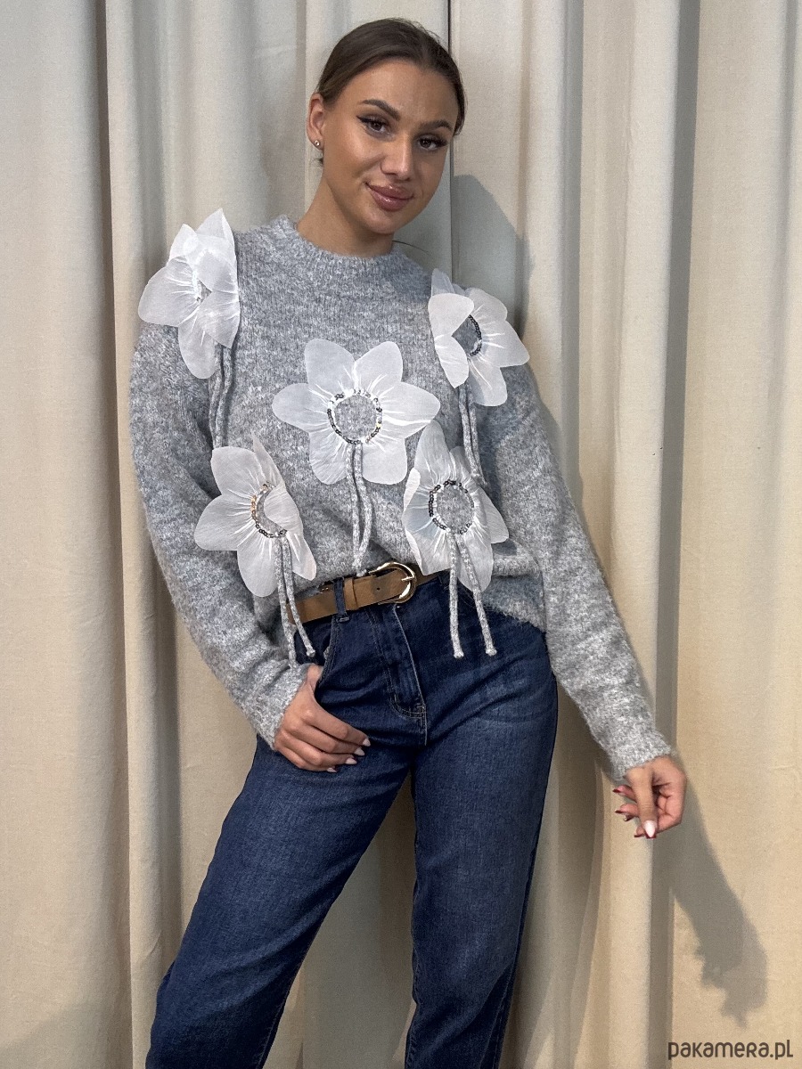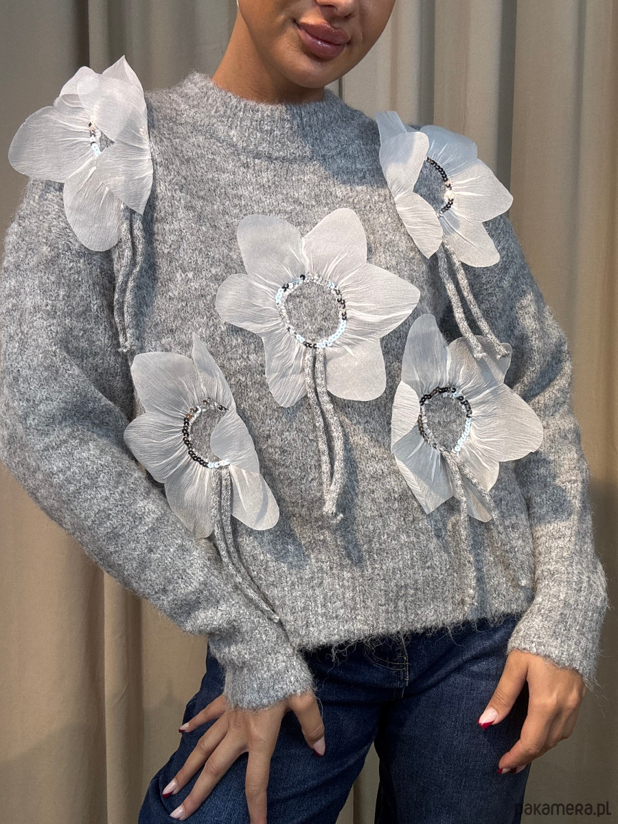 Sweter damski z aplikacjami kwiatów, obszytymi cekinami.