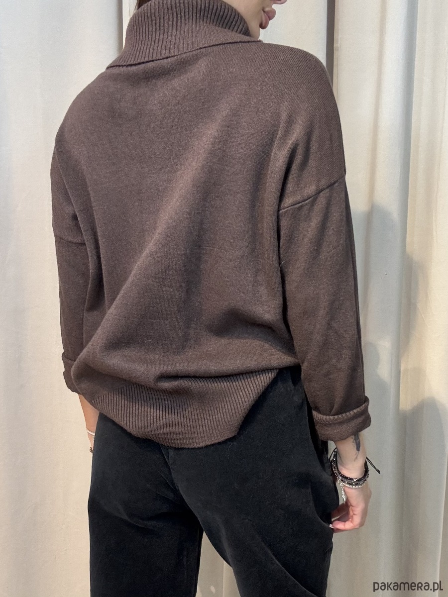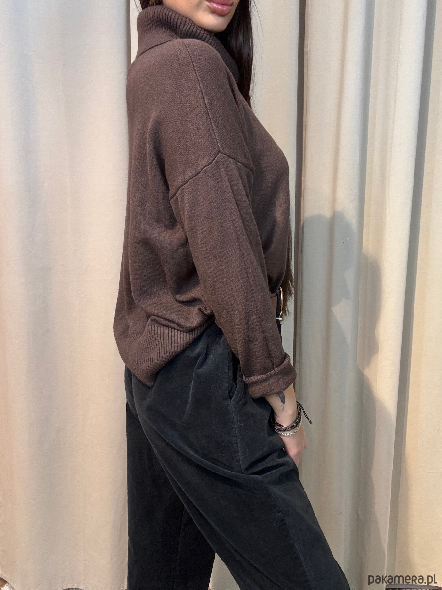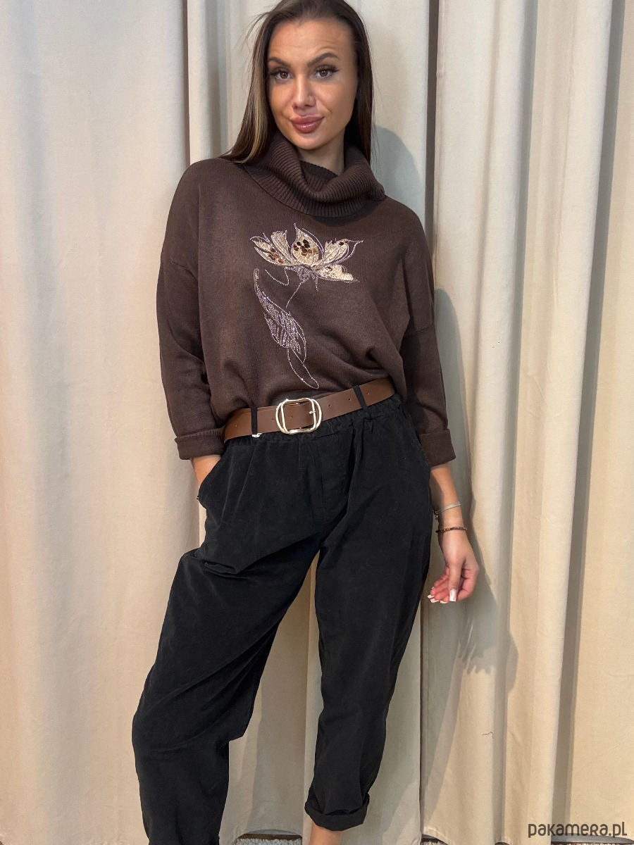 Wiskozowy sweter damski z ozdobnym kwiatem na froncie.