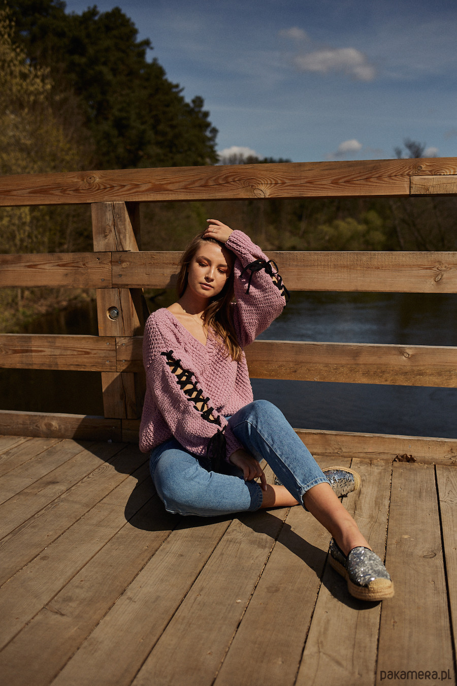 Szeroki sweter w kształcie bombki, dekolt w kształcie litery V można nosić z przodu bądź z tyłu. Wykonany z miękkiej peruwiańskiej wełny owczej i alpaki. Szerokie rozcięte rękawy związane czarnym bawełnianym sznurkiem. Można wyjąć sznurek i powstaną modne podłużne dziury na rękawach. Ręcznie robiony na drutach. Wszystkie użyte wełny są świetnymi termoizolatorami, zapobiegają przenikaniu gorącego powietrza przez włókna, dlatego latem będą nas chłodzić a zimą grzać, zatrzymując ciepło. Wysyłka wynosi do 10 dni roboczych ze względu na czasochłonność przy tworzeniu naszych ubrań. Czas ten może skrócić się nawet do 2 dni w przypadku, gdy będziemy mieć gotowy produkt na stanie. Możliwość wykonania pod wymiar na indywidualne zamówienie.