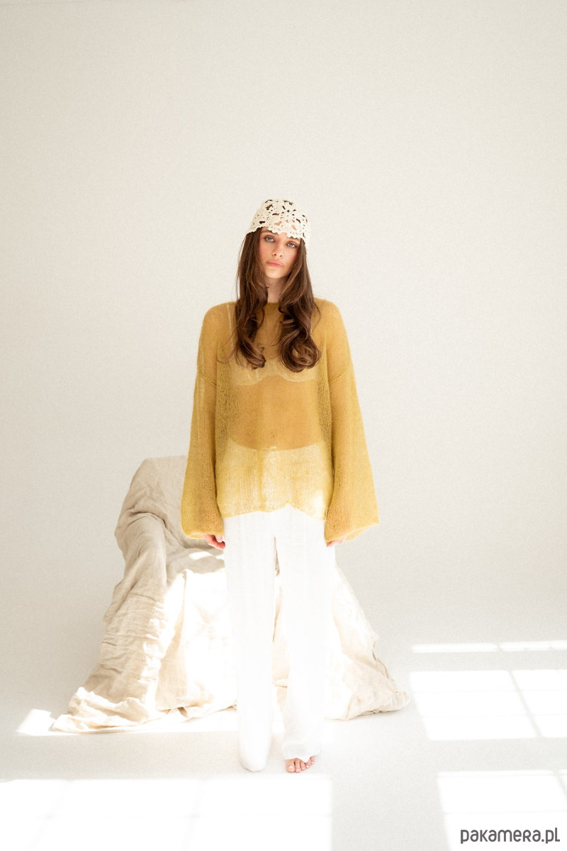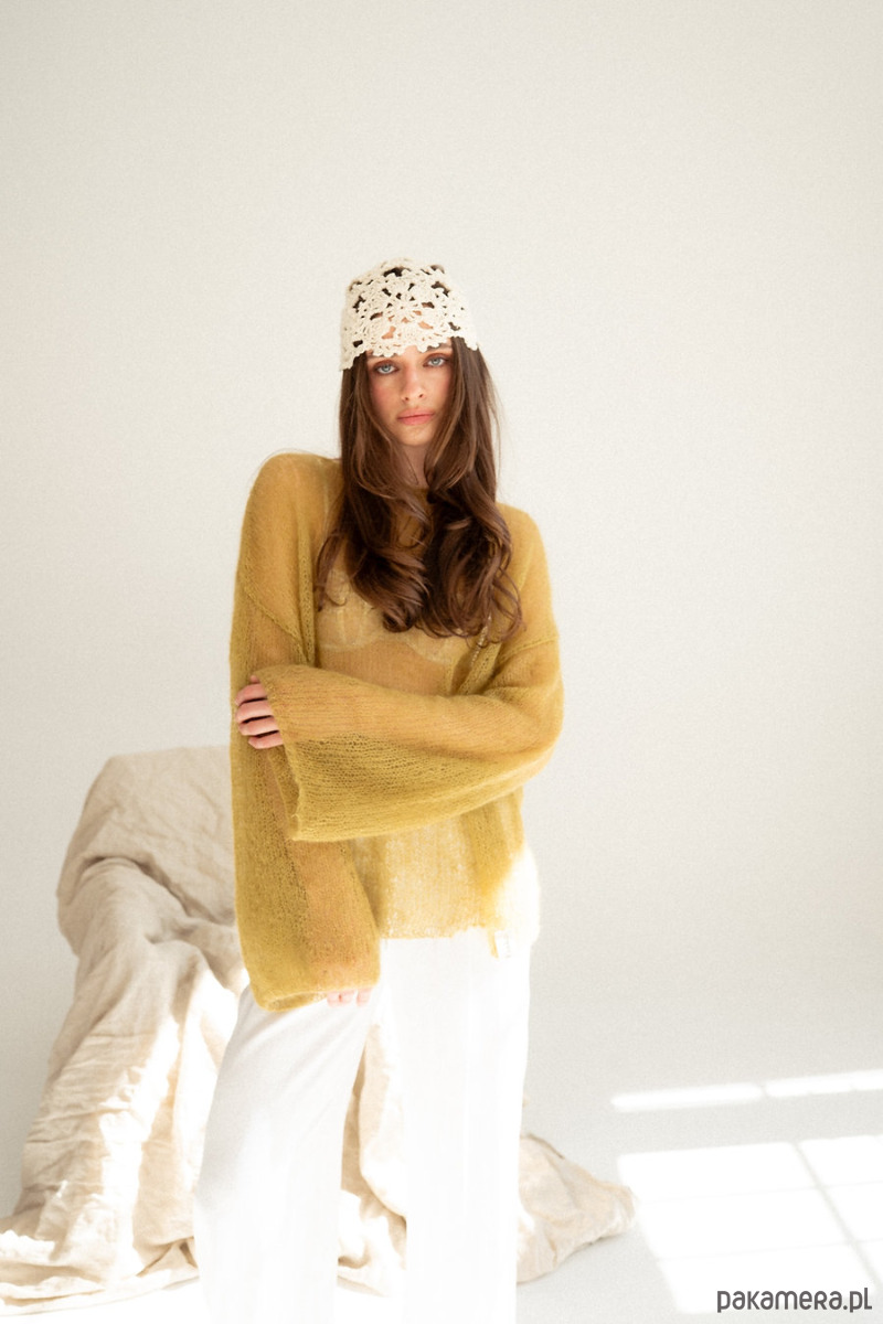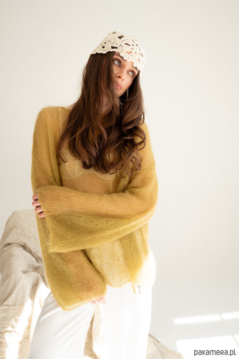 Sweter Lucia to powiew lata. Mgiełka która doda lekkości i kobiecości. Wydziergana z delikatnego moheru z jedwabiem. Załóż ją na koronkowy stanik, delikatny top bądź koszule. Ten sweter pokochasz za cudowny prosty krój i szerokie rękawy,