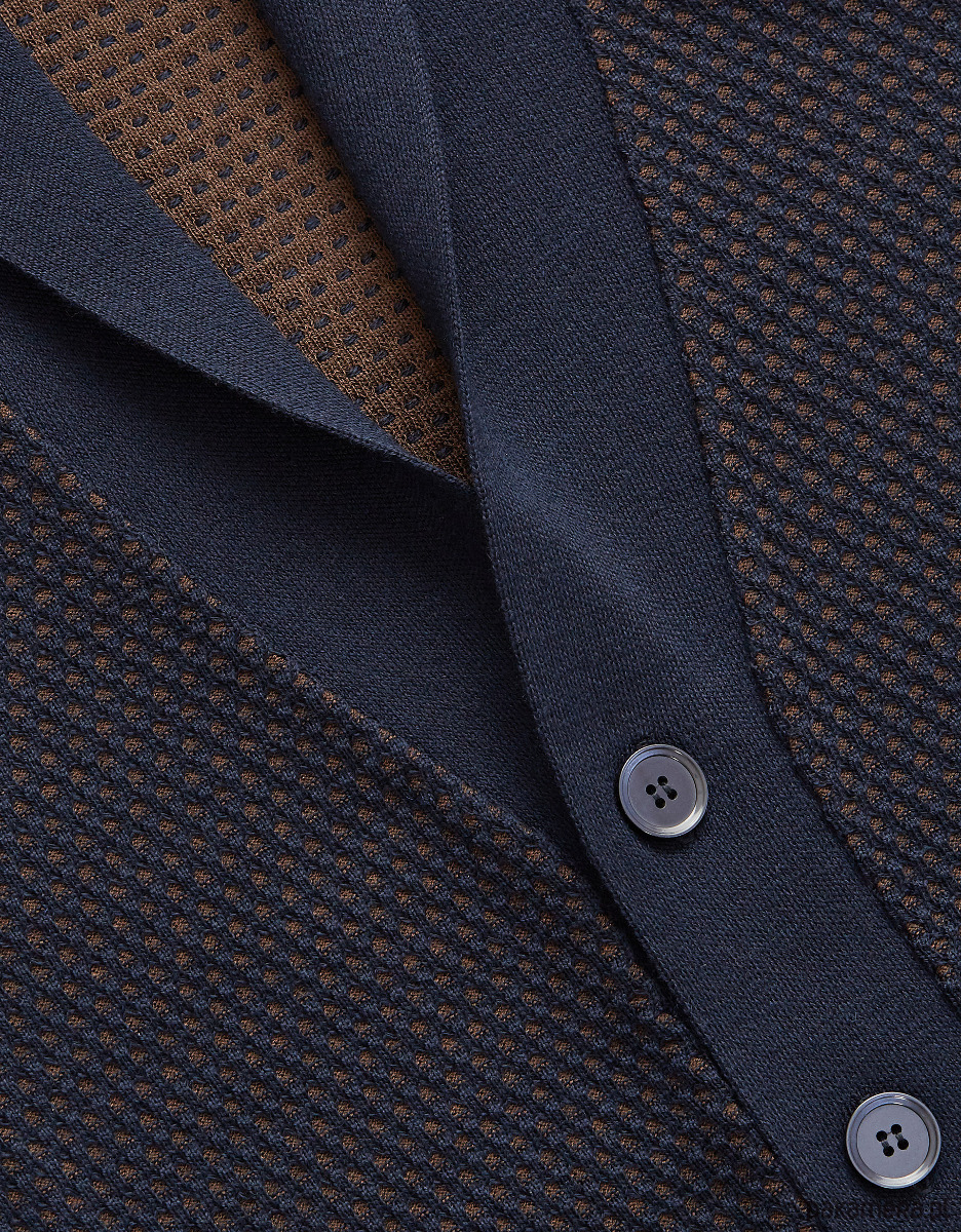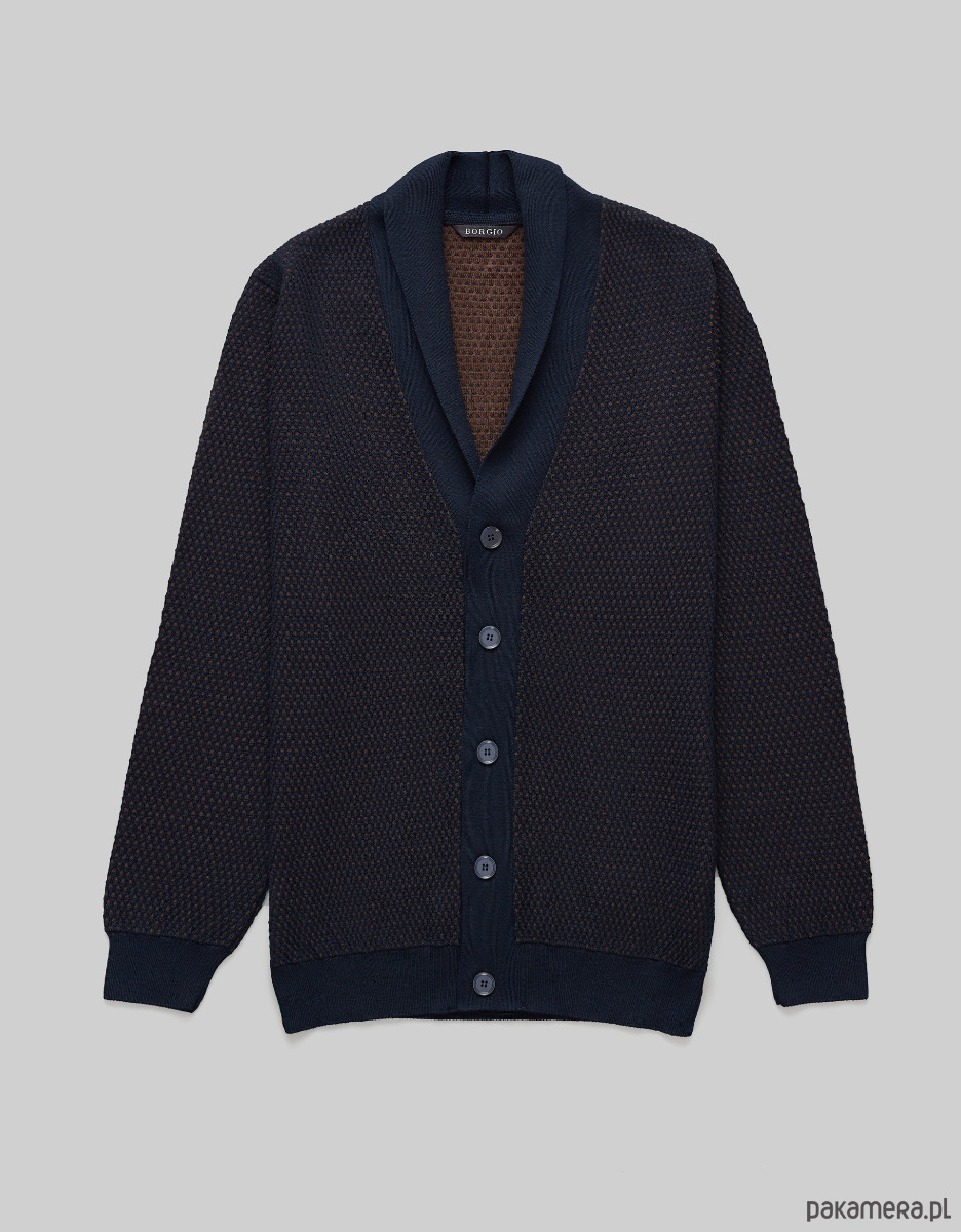 Sweter męski rozpinany jesi granatowy sweter jesi granatowy długi rękawCiepły, rozpinany na guziki sweter Jesi w kolorze granatowo-brązowym, został wykonany z wysokogatunkowej włoskiej wełny oraz akrylu. Doskonale zastąpi marynarkę, a dzięki elastycznej przędzy zapewni komfort i swobodę ruchów. Dwukolorowy splot oraz szalowy kołnierz nadają mu niepowtarzalnego charakteru.