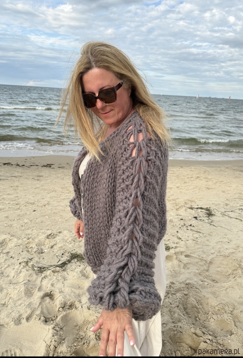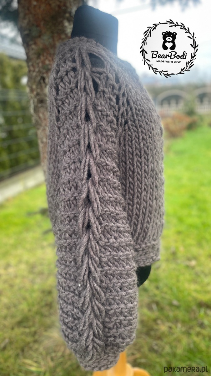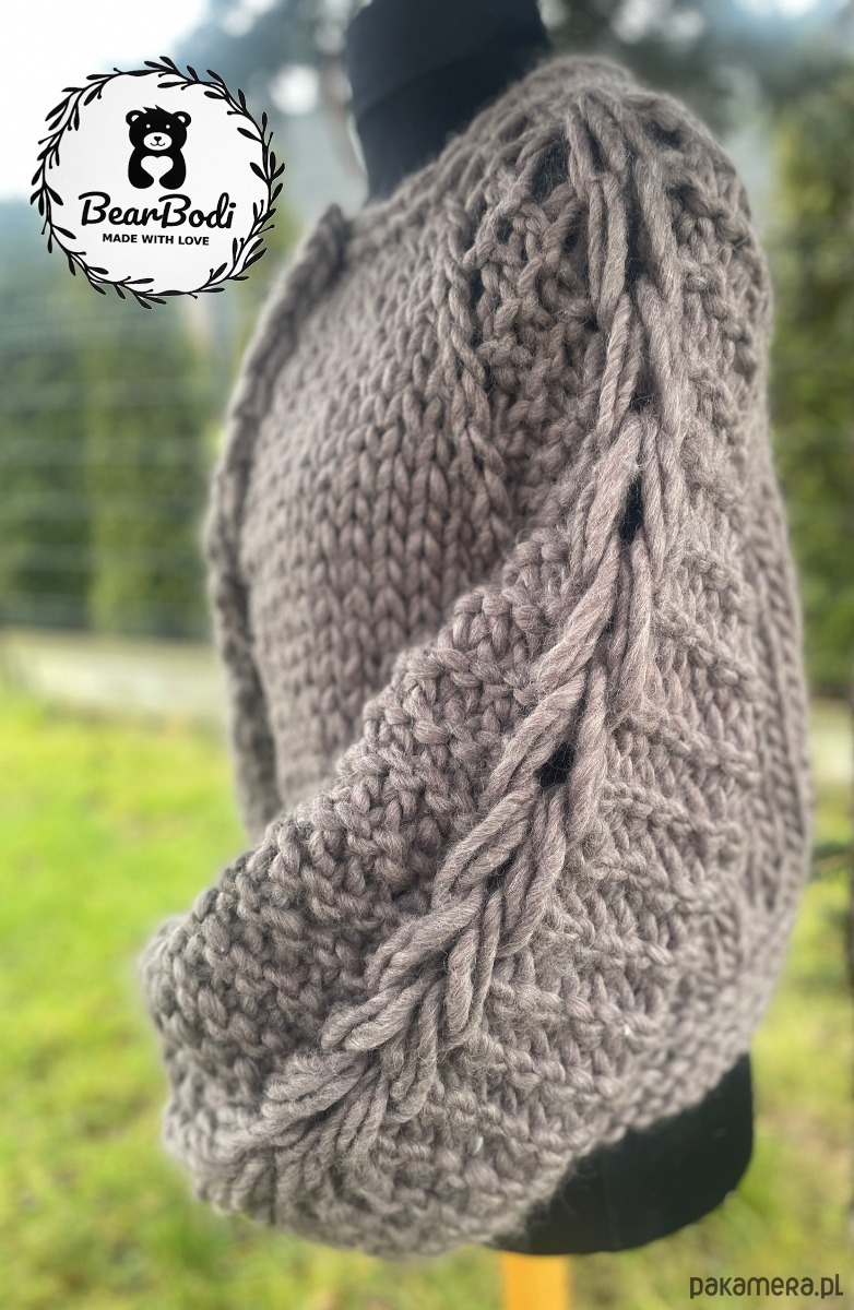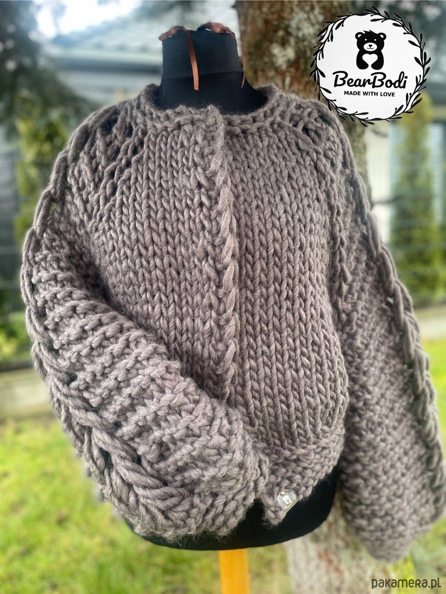 Unikatowy, oversize’owy sweter wykonany ręcznie z naturalnej wełny w uniwersalnym odcieniu szaro brązowym. Ciepły, miękki i idealny przez cały rok.Klasyczny splot z ozdobnymi warkoczami dodaje mu wyjątkowego uroku. Pasuje na rozmiary od M do XL.
